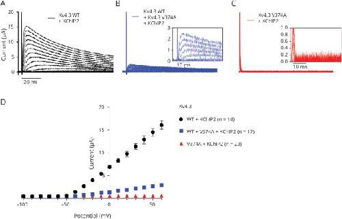 Figure 1. Kv4.3 WT/V374A/KChIP2 Currents and I-V Relationships(A) Representative traces of Kv4.3 WT:V374A (1:0). (B) Representative traces of Kv4.3 WT:V374A (0.5:0.5). Inset demonstrates first 40 ms at voltage increments of 20 mV (between −100 and +60 mV). (C) Representative traces of WT:V374A (0:1). Inset demonstrates first 40 ms at voltage increments of 20 mV (between −100 and +60 mV). (D) I-V relationships for (A–C) measured at the peak current. The holding potential was −100 mV. Voltage steps of 10 mV during 1,000 ms. The interpulse interval was 5 seconds. KChIP2 = potassium channel interacting protein 2; WT = wild-type.