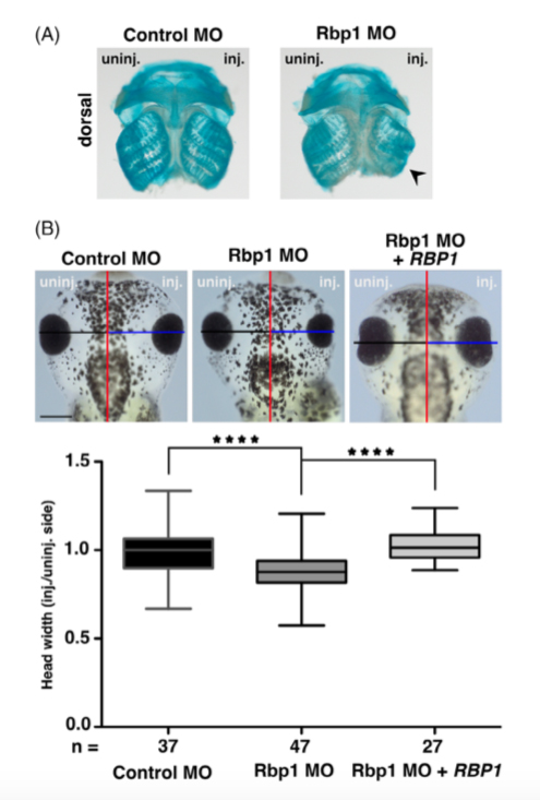 Figure 5. Retinol binding protein 1 knockdown results in reduced cranial cartilage structures. A, Knockdown of retinol binding protein 1 (Rbp1) led to reduced cartilage structures at stage 45, as shown by Alcian blue staining (black arrowhead). Uninjected and control morpholino oligonucleotide (MO)-injected sides showed no cartilage deformations. B, Comparison of the head width of Rbp1 MO-injected (blue line) and uninjected (black line) sides in Xenopus embryos at stage 42. The head width of the Rbp1 MO-injected side was significantly reduced. In contrast, the control MO-injected embryos were unaffected. The reduced head width was significantly rescued by injecting human Î50UTR RBP1 RNA. A statistical evaluation is given. Single embryos from one experiment (with a representative phenotype) were evaluated. Scale bar: 500 μm. Abbreviations: inj., injected; MO, morpholino oligonucleotide; n, number of independent experiments; Rbp1, retinol binding protein 1; uninj., uninjected. Statistics: Error bars show SEM; ****P ⤠.0001. P values were calculated by a nonparametric, one-tailed Mann-Whitney rank sum test |
