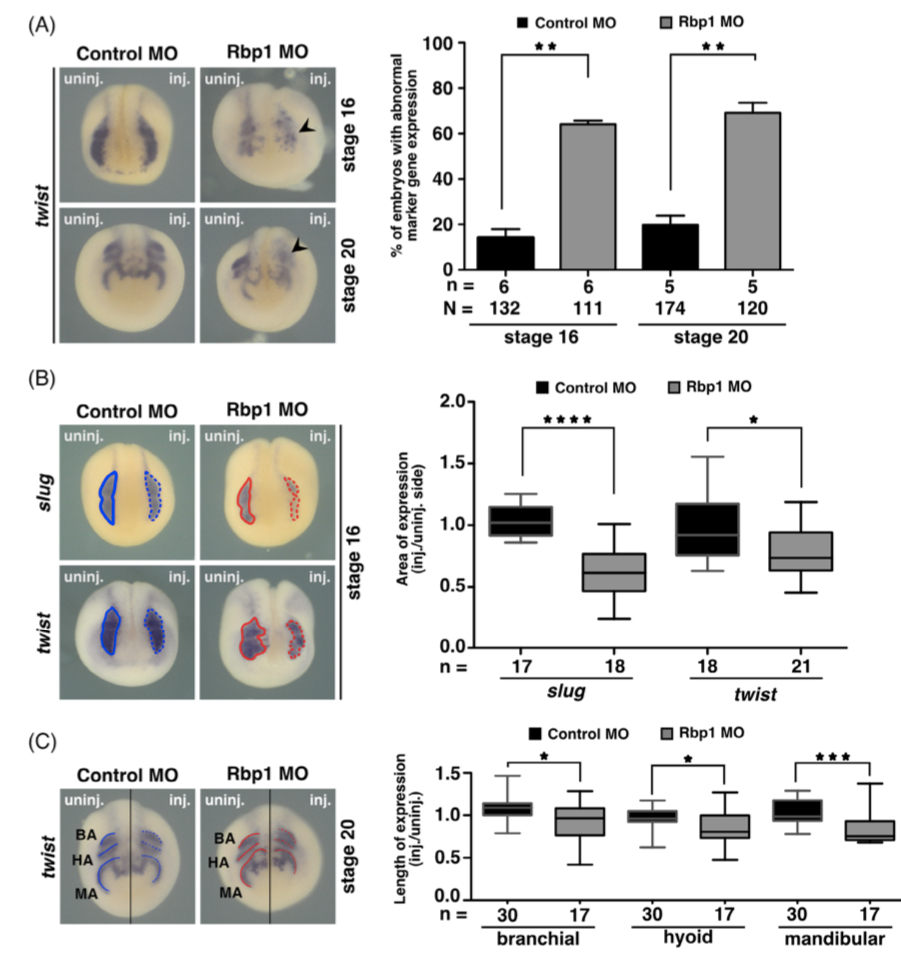 Figure 6. Retinol binding protein 1 knockdown leads to defects during anterior neural crest cell development. A, Anterior views are given. Upon retinol binding protein 1 (Rbp1) depletion, abnormal twist expression was observed at stages 16 and 20 (black arrowheads). A statistical evaluation is given. B, Measurement of the expression area of slug and twist at stage 16 upon injection of control morpholino oligonucleotide (MO; blue dotted circle) or Rbp1 MO (red dotted circle). Single embryos from one experiment with a representative phenotype were evaluated. A statistical evaluation is given. C, Calculation of the length of twist expression domains at stage 20 upon injection of control MO (uninjected: blue line; injected: dotted blue line) or Rbp1 MO (uninjected: red line; injected: dotted red line). Statistical evaluations for the length of branchial, hyoid, and mandibular arches are given. Single embryos from one experiment with a representative phenotype were evaluated. Abbreviations: BA, branchial arches; HA, hyoid arches; inj., injected; MA, mandibular arches; MO, morpholino oligonucleotide; N, number of evaluated embryos in total; n, number of independent experiments; Rbp1, retinol binding protein 1; uninj., uninjected. Statistics: Error bars show SEM; *P ⤠.05; **P ⤠.01; ***P ⤠.001; ****P ⤠.0001. P values were calculated by a nonparametric, one-tailed Mann-Whitney rank sum test |