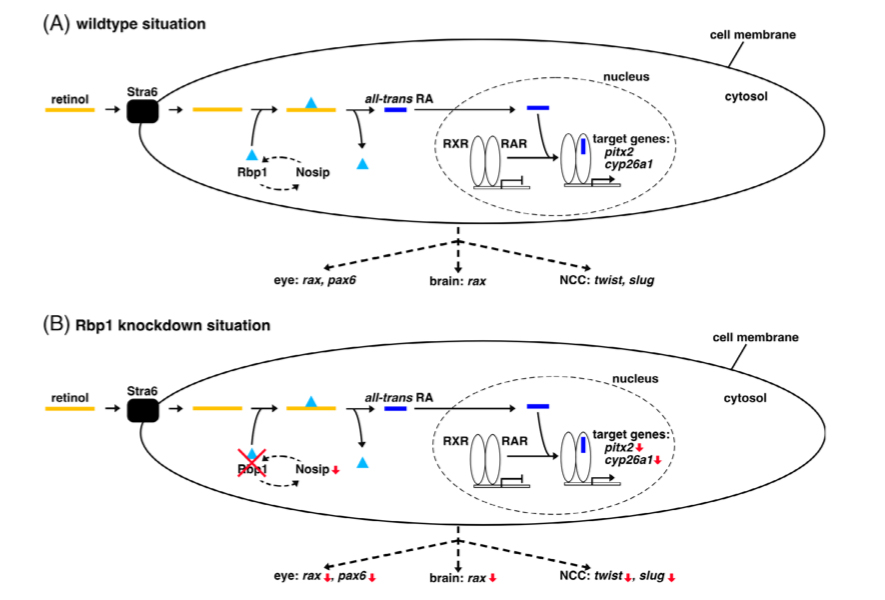 Figure 8. Schematic representation of retinol binding protein 1 function in all-trans retinoic acid signaling. A, Schematic overview representing the wild-type situation. Retinol binding protein 1 (Rbp1) is required for the transport of retinol within the cell and the conversion of retinol to all-trans retinoic acid (RA). In the cell, Rbp1 and Nosip regulate each other. All-trans RA activates gene expression of the direct target genes pitx2 and cyp26a1. For proper development of the eye, brain and neural crest cells (NCCs), the depicted marker genes are required. B, Schematic overview of the situation in Rbp1 knockdown. Depletion of Rbp1 resulted in reduced nosip expression (this study); likewise, Nosip knockdown led to reduced expression of rbp1.13 Upon Rbp1 knockdown, expression of pitx2 and cyp26a1 was down- regulated. Furthermore, expression of eye-, brain- and NCC-specific marker genes was reduced upon loss of Rbp1. Abbreviations: all-trans RA, all-trans retinoic acid; NCC, neural crest cell; Nosip, nitric oxide synthase interacting protein; pax6, paired box 6; pitx2, paired like homeodomain 2; RAR, retinoic acid receptor; rax, retina and anterior neural fold homeobox 1; Rbp1, retinol-binding protein 1; RXR, retinoid X receptor; slug, snail family zinc finger 2; Stra6, signaling receptor and transporter of retinol STRA6; twist, twist family bHLH transcription factor 1 |