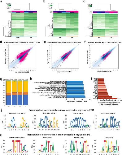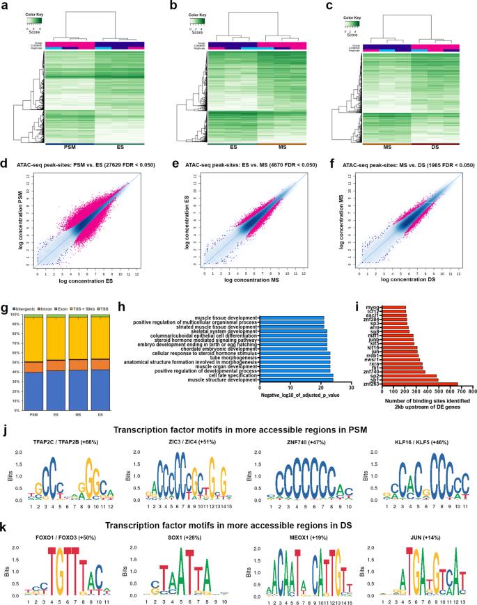 Fig. 2: Genome-wide profile of chromatin accessibility dynamics during somite development. a Correlation heat maps of accessible chromatin regions (ATAC-seq peak sites) comparing PSM and ES, b ES and MS and c MS and DS. d MA plots of significantly differential peak sites (pink) comparing PSM with ES, e ES with MS and f MS with DS. g Bar plot showing proportions of total genome sequence of peaks in PSM, ES, MS and DS (error barsâ=âSD). Nearly half of all peaks lie within 50âkb of the promoter and TSS and half are in intergenic and intron regions. h GO terms associated with enriched transcription factors in DS compared to PSM. For enriched GO terms, p values were obtained from a modified Fisher exact test. i Number of transcription factor binding sites identified within 2âkb upstream of differentially expressed genes in DS compared to PSM. j Motif enrichment analysis performed using Homer. Transcription factor motifs identified as enriched in PSM accessible regions and k in DS accessible regions. Percentage indicates increase of motifs identified in either PSM or DS for each motif. |