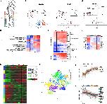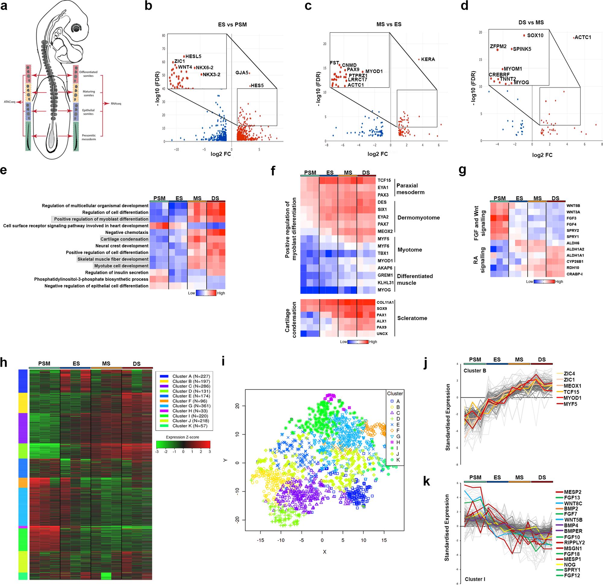 Fig. 1: Transcriptional profiling of developing somites. a Schematic representation of HH14 chick embryo with presomitic mesoderm (PSM), epithelial somite (ES), maturing somite (MS) and differentiated somite (DS) dissected for RNA-seq and ATAC-seq, in triplicate. bâd Volcano plots showing enriched genes (log fold change >1.5) comparing PSM with ES, ES with MS, and MS with DS. e Heat map showing GO terms associated with PSM or DS enriched genes. f Clusters of highly correlated genes identified for myoblast differentiation and cartilage condensation. g Wnt, FGF and retinoic acid (RA) signalling pathways are shown in heat map. h Heat map showing k-means linear enrichment clustering across PSM, ES, MS and DS. i Dimension reduction algorithm t-SNE used to map top genes in each cluster determined by k-means. j Cluster B and k Cluster I are shown with some genes labelled to identify key transcription factors and signalling components. |