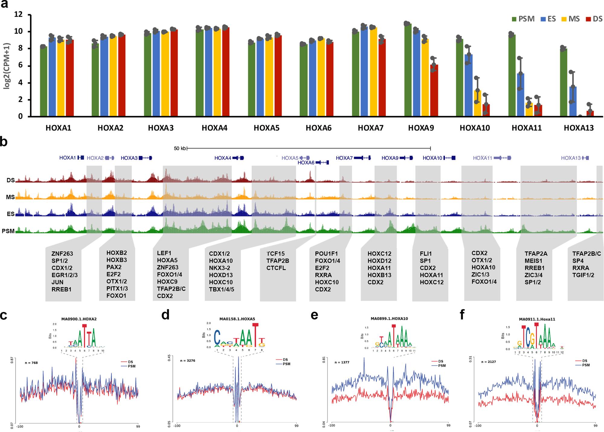 Fig. 4: Chromatin accessibility and differential footprints for HoxA cluster. a Gene expression from mRNA-seq for HoxA cluster (error barsâ=âSEM, nâ=â3) in paraxial mesoderm regions. b Genome browser views of ATAC-seq profile across the HoxA cluster. ATAC and RNA profiles are shown in green for PSM, in blue for ES, in yellow for MS and in red for DS. Grey boxes indicate intergenic accessible regions and transcription factor footprints identified within those regions. Genome-wide differential footprinting for (c) HoxA2, (d) HoxA5, (e) HoxA10 and (f) HoxA11 between PSM and DS. |