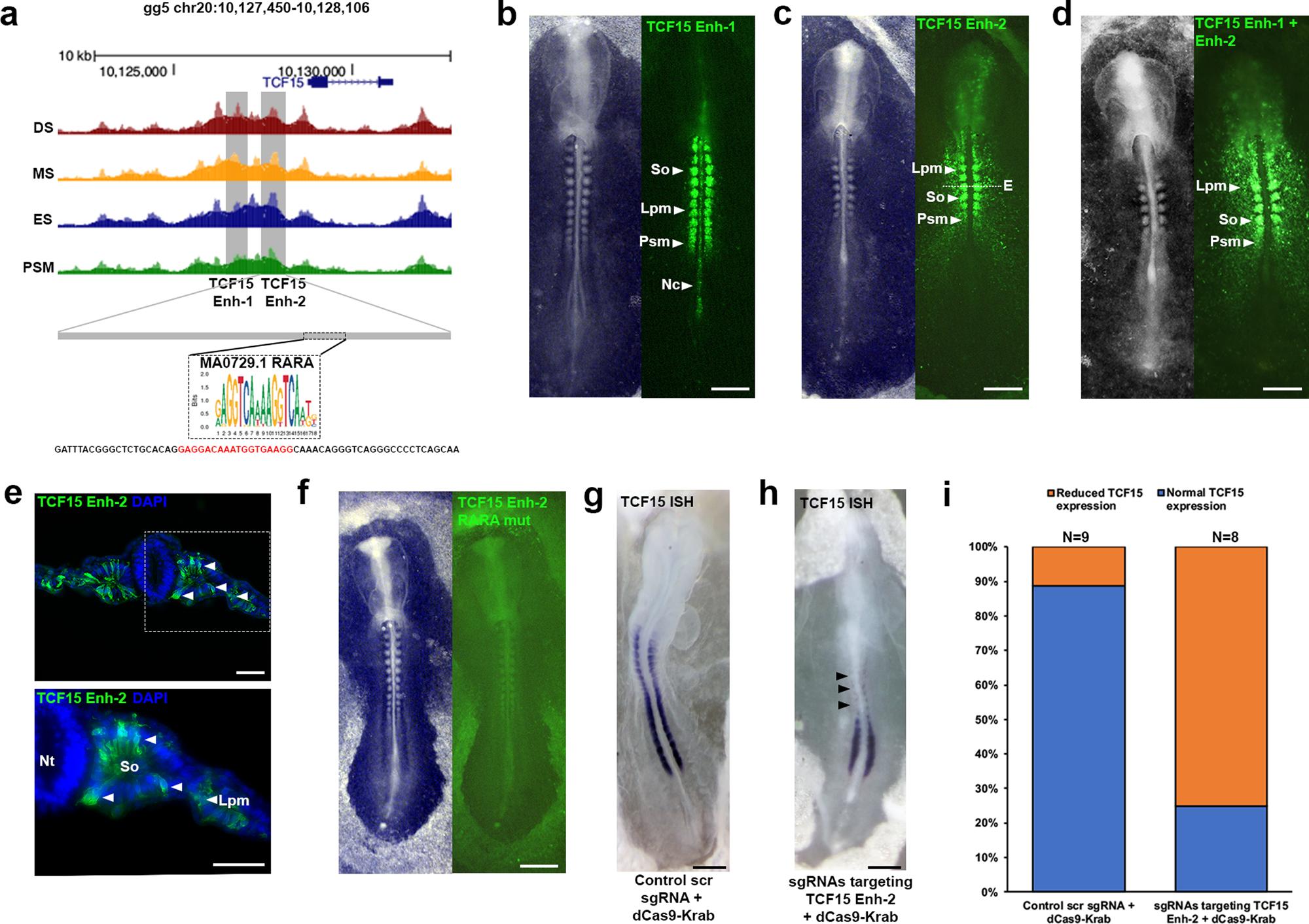 Fig. 5: Identification of a regulatory element for TCF15. a ATAC-seq profile at the TCF15 locus. Grey boxes indicate putative enhancers identified (TCF15 Enh-1 and TCF15 Enh-2). RARA footprint identified within TCF15 Enh-2. Mutant reporter sequence for TCF15 Enh-2 RARA mutant. b TCF15 Enh-1 (nâ=â15/15) and c TCF15 Enh-2 (nâ=â9/9) reporter expression in presomitic mesoderm (Psm), notochord (Nc), somites (So) and lateral plate mesoderm (Lpm). d Combined TCF15 Enh-1/Enh-2 reporter expression (nâ=â9/9). e Transverse sections of embryo in c immunostained for Citrine showing TCF15 Enh-2 expression in somites and lateral plate mesoderm, white dashed line in c indicates location of section, representative of (nâ=â4/4). Nuclei stained with DAPI (blue). f TCF15 Enh-2 Citrine reporter with RARA binding site mutation displays lack of expression in somites (nâ=â6/6). Epigenome engineering using dCas9-Krab with (g) control scrambled sgRNAs resulted in no change (nâ=â8/9) and (h) sgRNAs targeting endogenous RARA binding site led to loss of TCF15 expression (nâ=â6/8) as shown by wholemount in situ hybridisation. i Percentage of embryos with normal (blue) or reduced (orange) TCF15 in situ expression after electroporation of control scrambled sgRNA with dCas9-Krab or sgRNAs targeting TCF15 Enh-2 RARA binding site with dCas9-Krab. All scale barsâ=â500âμm except for e scale barâ=â100âμm. |