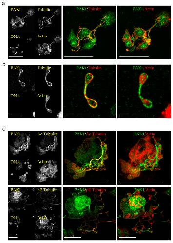 Figure 1. Endogenous PAK1 decorates microtubules (MTs) and actin in megakaryocyte proplatelets (PPL) extensions and in preplatelets. (a,b) Representative MIP images of E13.5 mouse embryo liver cells-derived megakaryocytes extending PPLs (a) and released preplatelets (b) stained for endogenous PAK1, total tubulin and F-actin. Bars are 50 µm (a) and 10 µm (b). (c) Representative MIP images of E13.5 mouse embryo liver cells-derived megakaryocytes extending PPL-like extensions (PPLLs) stained with PAK1, F-actin and either acetylated-tubulin (Ac-Tubulin) or polyglutamylated-tubulin (pE-Tubulin). Bars are 50 µm. All images were acquired on a Leica SP8-UV confocal microscope with a 63x HCX Plan APO 1.4NA oil CS2 objective.