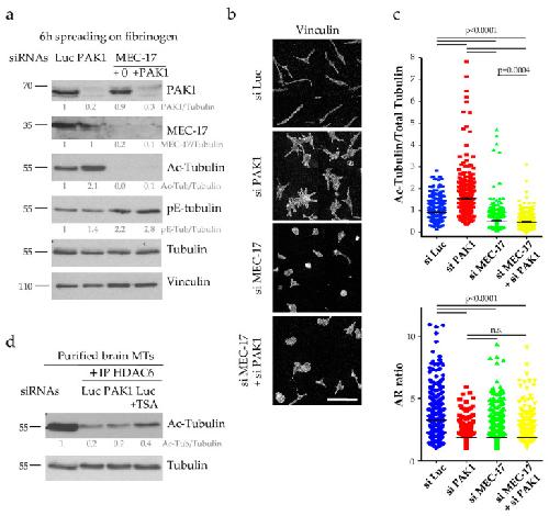 Figure 5. PAK1 does not regulate the HDAC6 pathway (a) Total protein extracts of Luc, PAK1, MEC-17 and MEC-17+PAK1 depleted D723H cells (using partial MEC-17 depletion, 15 nM siRNA) were analyzed by western blots with indicated antibodies. Protein bands were quantified by densitometry and normalized to tubulin. Values below protein bands represent their relative abundance. (b) Immunofluorescence images at low magnification (mount image of wide field ×40, scale bar is 100 µm) of the cells treated as in (a). (c) Quantification of Acetyl-tubulin/Total tubulin ratio and AR ratio of cells treated as in (a) and immunostained with anti-tubulin, anti-acetylated tubulin or vinculin antibodies. The number of cells analyzed varies from 441 to 845 and were obtained from three independent experiments. Statistical calculations were performed using a two-tailed unpaired Student’s t test. p