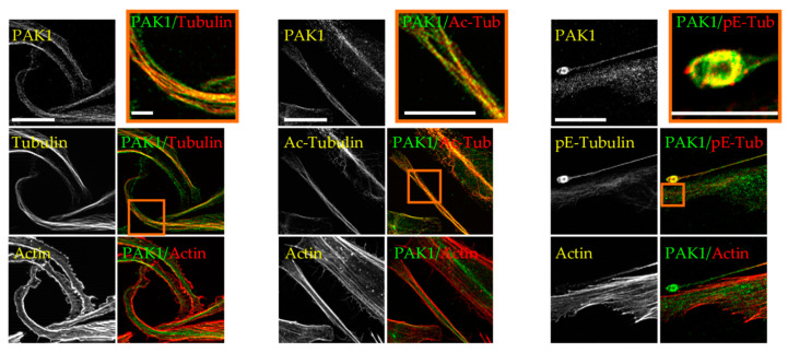 Figure 2. Endogenous PAK1 decorates MTs and actin in PPLL extensions of D723H cells. Representative MIP images of PPLL extensions of D723H cells spread on fibrinogen for 16 h and stained for endogenous PAK1, F-actin and either total tubulin, acetylated-tubulin (Ac-Tub) or polyglutamylated-tubulin (pE-Tub). Bars are 20 µm. Orange frames (high magnification insets) are single confocal slices (Bars are 10µm). All images were acquired on a Leica SP8-UV confocal microscope with a 63× HCX Plan APO 1.4NA oil CS2 objective.