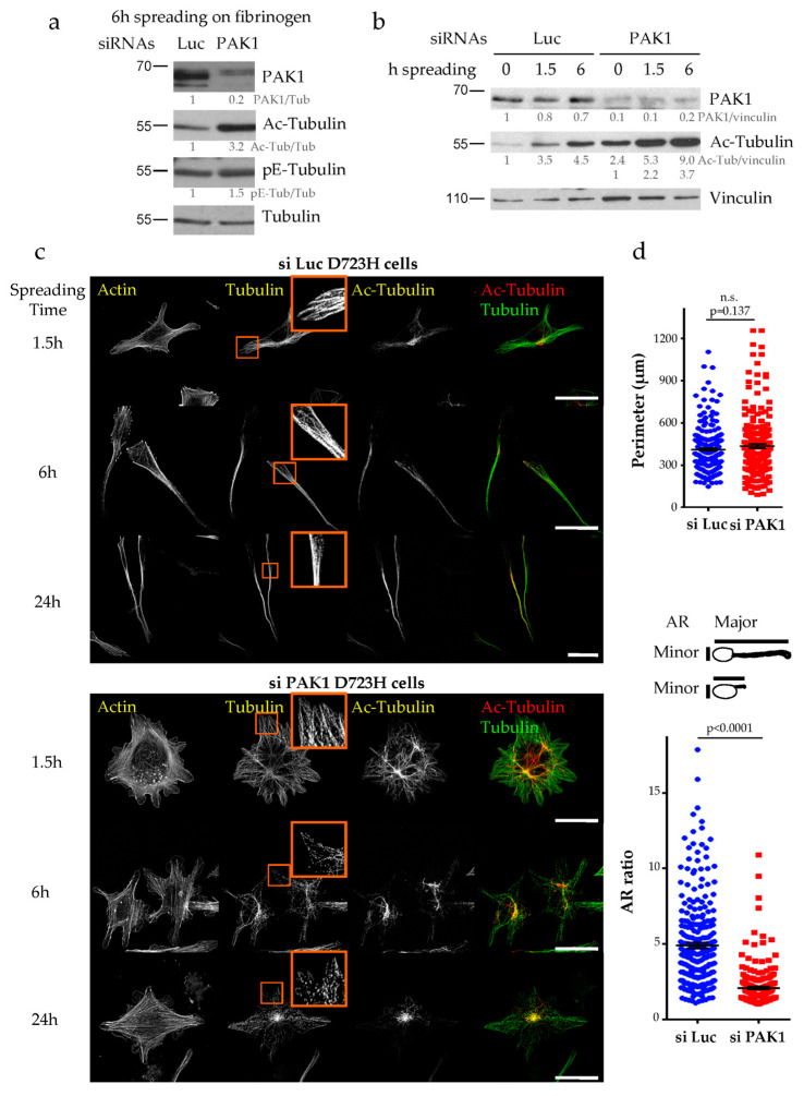 Figure 3. Loss of PAK1 induces the formation of multiple short protrusions, increases MT acetylation and disrupts MT integrity. (a,b) Luc and PAK1-depleted D723H cells were starved for 2 h, 48 h post transfection and spread on fibrinogen for the given number of hours. Total cell extracts were analyzed by western blot. Protein bands were quantified by densitometry and normalized using tubulin (a) or vinculin (b). Values below protein bands represent their relative abundance. (c). MIP of representative images of Luc and PAK1-depleted D723H cells stained for actin, tubulin and acetylated-tubulin (Ac-Tub) at different times of spreading on fibrinogen. Bars are 30 µm. Orange frames are high magnifications of 15 × 15 µm². (d). Quantification of the cell perimeter and AR ratio (ratio of the cell major/minor axis) were performed after 6 h of spreading on fibrinogen. A total of 259 si Luc and 208 si PAK1 cells were counted from three independent experiments. Statistical calculations were performed using a two-tailed unpaired Student’s t test. p
