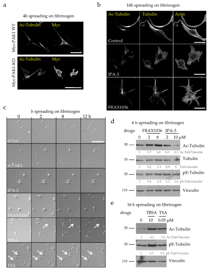 Figure 4. The kinase activity of PAK1 is required for its action on MT acetylation, MT integrity and PPLL formation. (a) Representative MIP images of Myc-PAK1 and Myc-PAK1-KD transfected D723H cells (24 h) followed by serum starvation and spreading for 4 h on fibrinogen. Bars are 50 µm. (b) Representative MIP images of D723H cells treated 30 min after spreading on fibrinogen with vehicle (control) or IPA-3 (5 µM) or FRAX1036 (2 µM) for 16 h and stained for acetylated-tubulin (Ac-Tub), total tubulin and actin. Bars are 30 µm. (c) Phase contrast and wide field images of Luc-depleted, PAK1-depleted or drug-treated D723H cells were acquired at indicated times, bars are 100 µm (see also Supplementary Movies 1–6). (d,e). Western blot analyses of D723H cell extracts treated with the given drug concentrations and analyzed with indicated antibodies after 6 h (d) or 16 h (e) spreading on fibrinogen. Protein bands were quantified by densitometry and normalized to tubulin. Values below protein bands represent their relative abundance.