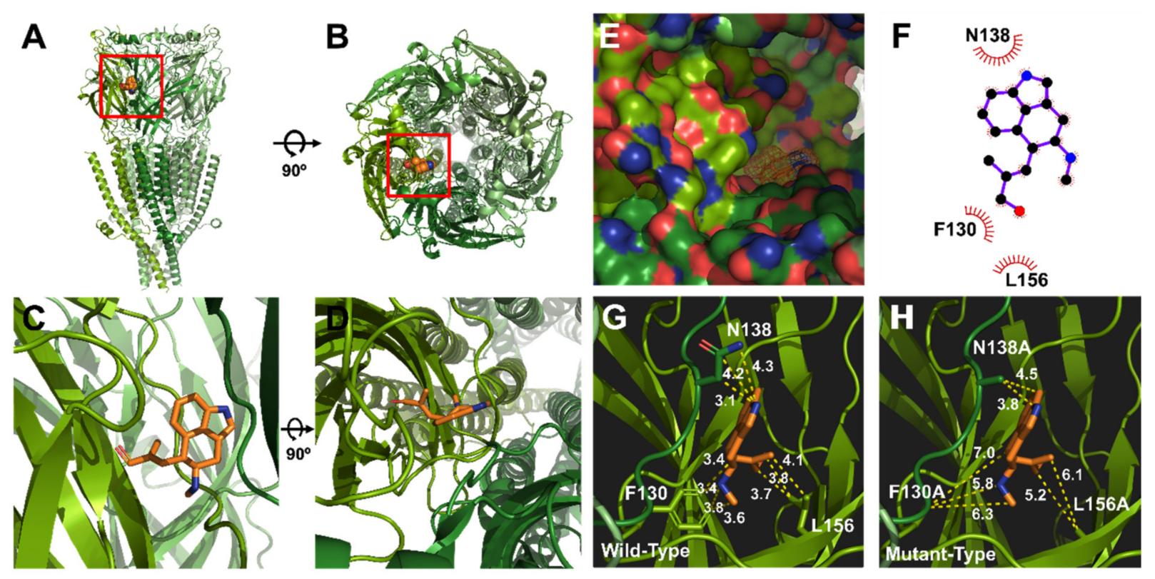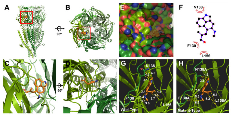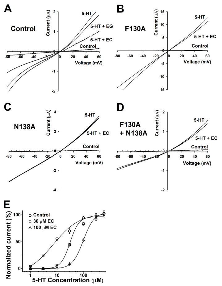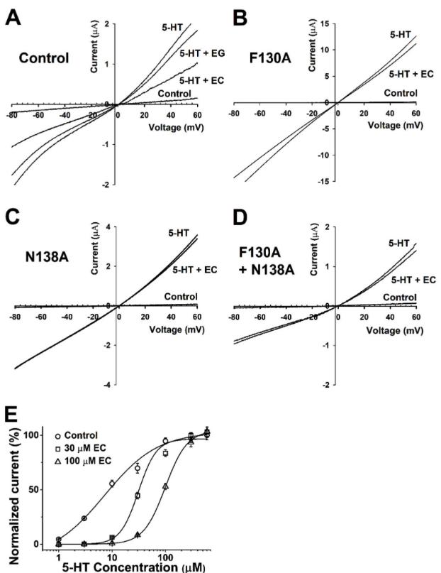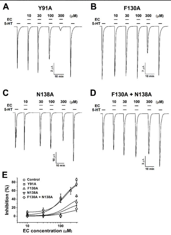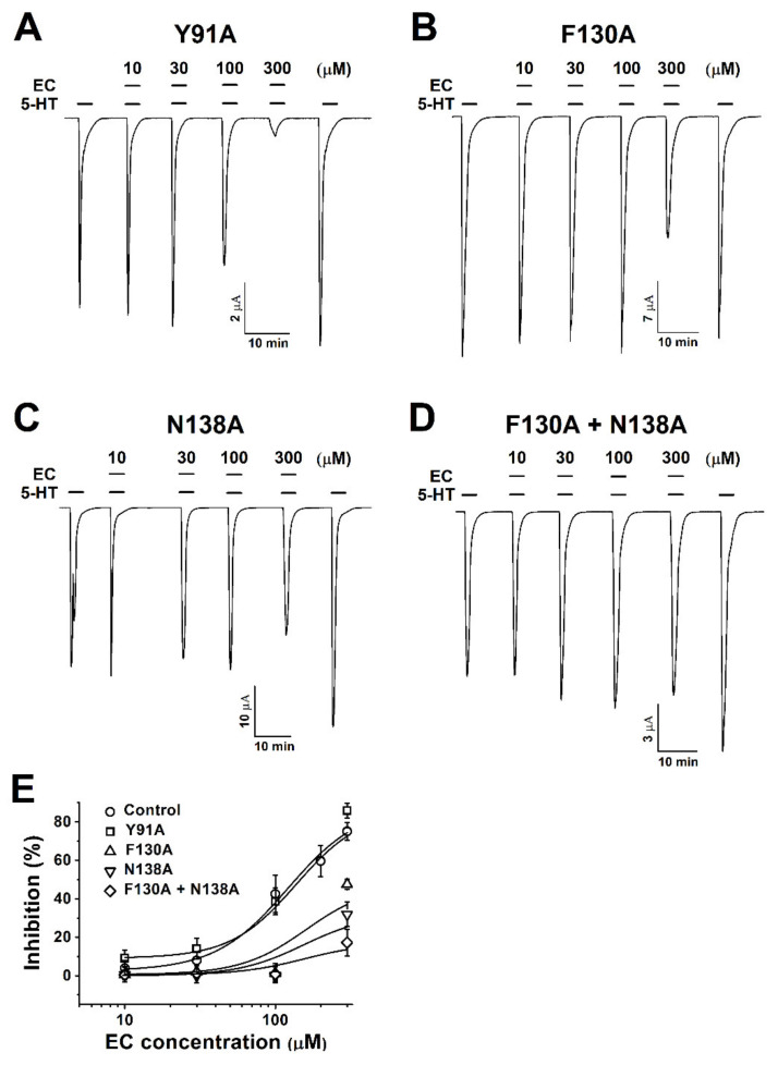 Irritable bowel syndrome (IBS) is a chronic disease that causes abdominal pain and an imbalance of defecation patterns due to gastrointestinal dysfunction. The cause of IBS remains unclear, but intestinal-brain axis problems and neurotransmitters have been suggested as factors. In this study, chanoclavine, which has a ring structure similar to 5-hydroxytryptamine (5-HT), showed an interaction with the 5-HT3A receptor to regulate IBS. Although its derivatives are known to be involved in neurotransmitter receptors, the molecular physiological mechanism of the interaction between chanoclavine and the 5-HT3A receptor is unknown. Electrophysiological experiments were conducted using a two-electrode voltage-clamp analysis to observe the inhibitory effects of chanoclavine on Xenopus oocytes in which the h5-HT3A receptor was expressed. The co-application of chanoclavine and 5-HT resulted in concentration-dependent, reversible, voltage-independent, and competitive inhibition. The 5-HT3A response induced by 5-HT was blocked by chanoclavine with half-maximal inhibitory response concentration (IC50) values of 107.2 µM. Docking studies suggested that chanoclavine was positioned close F130 and N138 in the 5-HT3A receptor-binding site. The double mutation of F130A and N138A significantly attenuated the interaction of chanoclavine compared to a single mutation or the wild type. These data suggest that F130 and N138 are important sites for ligand binding and activity. Chanoclavine and ergonovine have different effects. Asparagine, the 130th amino acid sequence of the 5-HT3A receptor, and phenylalanine, the 138th, are important in the role of binding chanoclavine, but ergonovine has no interaction with any amino acid sequence of the 5-HT3A receptor. The results of the electrophysiological studies and of in silico simulation showed that chanoclavine has the potential to inhibit the hypergastric stimulation of the gut by inhibiting the stimulation of signal transduction through 5-HT3A receptor stimulation. These findings suggest chanoclavine as a potential antiemetic agent for excessive gut stimulation and offer insight into the mechanisms of 5-HT3A receptor inhibition.
