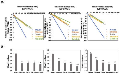 Figure 4. SDS-PAGE/native-PAGE MAP. The S/N MAP of brains from five different vertebrates is described based on the results of blots with each antibody. The results of SDS-PAGE (Figure 2) and native-PAGE (Figure 3) were used. (A) The typical S/N map of 12E3, 735, and 12F8 staining. (B) Relative slope value, K. The value for mouse was set to 1.0. The left, middle, and right panels stand for 12E3, 735, and 12F8, respectively. The values were obtained from the S/N maps from five different vertebrate brains (n = 3). * indicates p < 0.05. ** indicates p < 0.01. |