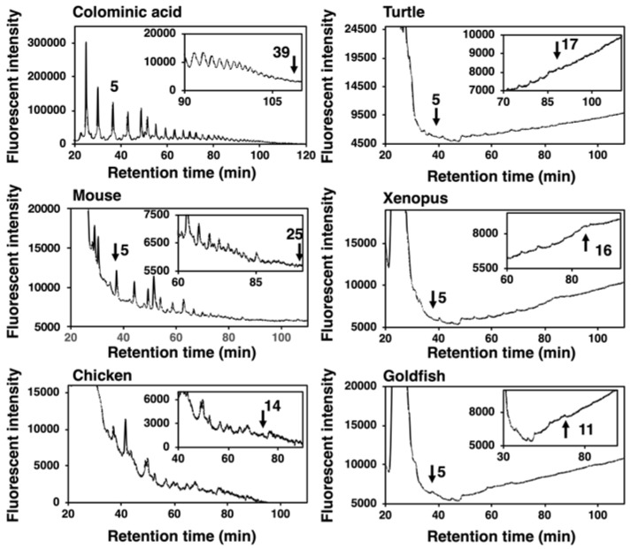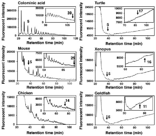 Figure 6. MH–FAEC analysis (Oligo-analysis) of brain homogenates from five vertebrate brains. Brains from five vertebrates (mouse, chicken, turtle, xenopus, goldfish, n = 1) were used. Brain homogenates (100 µg as protein) were subjected to mild acid hydrolysis followed by DMB derivatization. DMB-labeled oligo/polySia chains were applied to an anion exchange chromatography-HPLC analysis. |
