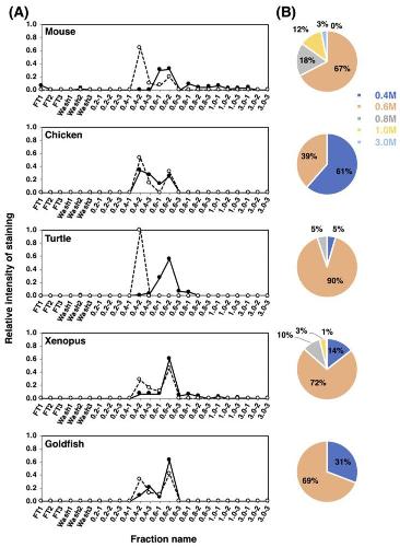 Figure 9. Sephacryl S-500 chromatograms of polySia-NCAM of brain homogenates from five vertebrate brains. Brains from five different vertebrates (mouse, chicken, turtle, xenopus, and goldfish, n = 1) were analyzed by the gel filtration. The elution profiles were monitored by native-PAGE/Western blotting of each fraction using 12E3 (Figure S3A). The left, middle, and right panels for each animal brain show the elution profiles in the regions of HMW (above 720 kDa), MMW (480–720 kDa), and LMW (less than 480 kDa), respectively. The sum of the intensity of the immunostaining of the fractions was set to 1.0. At the bottom panels, merged images of the profiles for five different vertebrate brains are shown. |