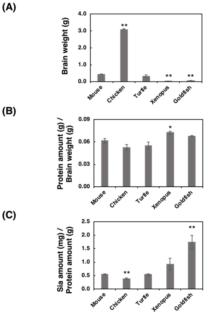 Figure 1. Comparison of brain weight, protein concentration, and Sia concentration for the five different vertebrate brains. Brains from five different vertebrates (mouse, chicken, turtle, xenopus, goldfish, (n = 3)) were used. (A) Comparison of the brain weights of the five vertebrate brains. (B) Protein amount (g) per brain weight (g). Brains were homogenized using lysis buffer, and a bicinchoninic acid (BCA) assay was performed to determine the protein concentration. (C) Sia amount (mg) per protein amount (g). Brain homogenate was treated with a strong acid to achieve hydrolysis of sialylglycoconjugates. All Sia residues were completely released and labeled with 1,2-dimethylenedioxybenzen (DMB). Sia–DMB was separated using a Wako Handy octadecylsilyl (ODS) column (250 mm × 4.6 mm, Wako). The absolute amount of Sia was calculated based on the authentic Neu5Ac. * indicates p < 0.05. ** indicates p < 0.01. |