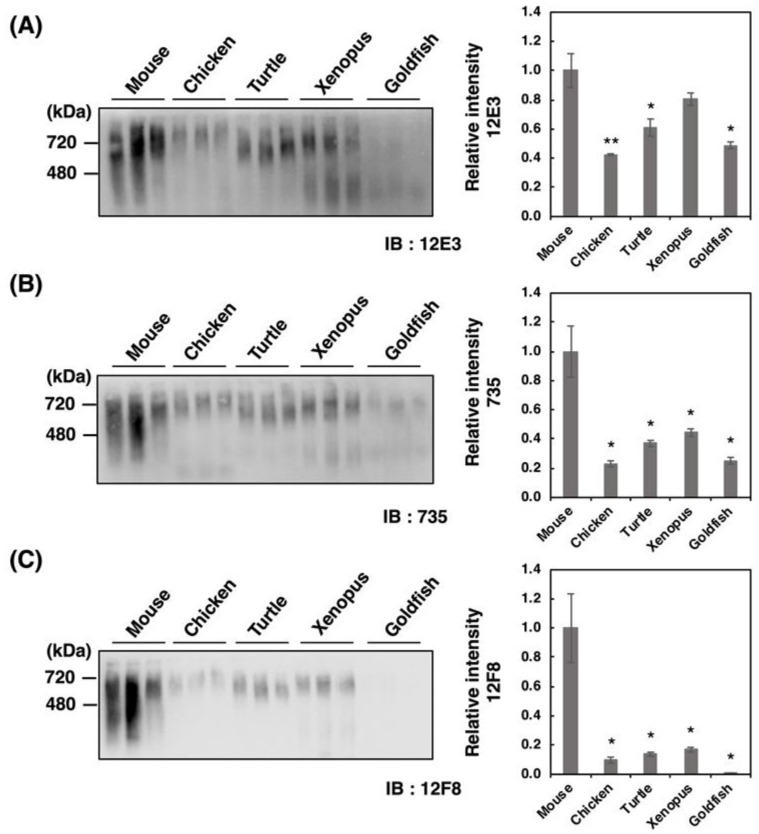 Figure 3. Native-PAGE/Western blotting of polySia-NCAM in brains from five different vertebrates. Brains from five vertebrates (mouse, chicken, turtle, xenopus, goldfish, n = 3) were used. PolySia expression was analyzed using native-PAGE/Western blotting. The brain homogenates of five vertebrate brains were separated by native-PAGE (7% polyacrylamide gel) and blotted onto PVDF membranes (10 µg as protein/lane). The polySia-NCAM was visualized using anti-polySia antibodies, (A) 12E3, (B) 735, and (C) 12F8. The left panel represents the immunoblots. The right panel shows the relative intensity of the polySia antibody. Mouse staining was set to 1.0. * indicates p < 0.05. ** indicates p < 0.01. |