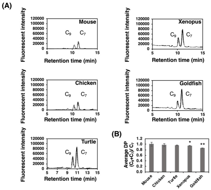Figure 7. Fluorometric C7/C9 analysis of brain homogenates of five different vertebrate brains. Brains from five vertebrates (mouse, chicken, turtle, xenopus, and goldfish, n = 3) were used. Brain homogenates (20 µg as protein) were subjected to the fluorometric C7/C9 method to measure the average degree of polymerization (DP). (A) Typical chromatograms of C7/C9 analysis of each brain. (B) Relative (C7+C9)/C7 index in each brain. * indicates p < 0.05. ** indicates p < 0.01. Mouse value was set to 1.0. |