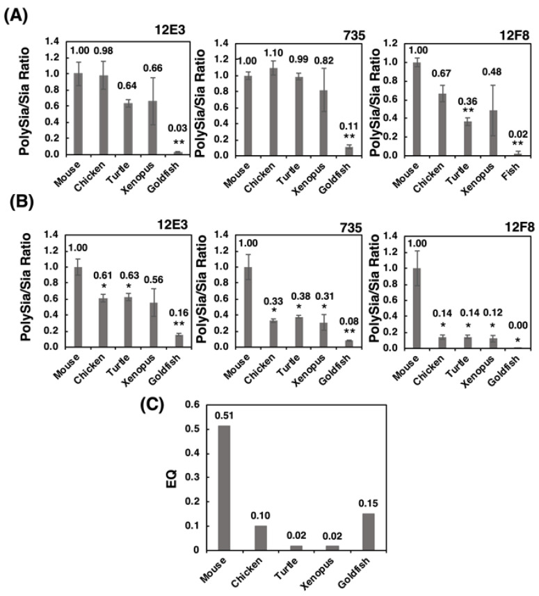 Figure 10. The polySia/Sia ratio and EQ value. The polySia/Sia ratio was calculated according to the intensity of anti-polySia-antibody per protein divided by the Sia amount per protein. (A) polySia/Sia ratio evaluated by SDS-PAGE/Western blotting. (B) PolySia/Sia ratio evaluated by native-PAGE/Western blotting. (C) The EQ value as a standard for evaluating the intelligence of vertebrates was calculated using an equation: EQ = K × [brain weight]/[body weight ]3/4 (K = 10, K was set to 10 for the convenience of calculation, although there were deviations among 8~16. * indicates p < 0.05. ** indicates p < 0.01. |