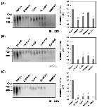 Figure 2. SDS–PAGE/Western blotting of polySia–NCAM derived from five vertebrate brains. Brains from five vertebrates (mouse, chicken, turtle, xenopus, goldfish, n = 3) were used. PolySia expression was analyzed using SDS-PAGE/Western blotting. The brain homogenates were separated by SDS-PAGE (7% polyacrylamide gel) and blotted onto polyvinylidene difluoride (PVDF) membrane (10 µg as protein/lane). The polySia-NCAM was visualized using anti-polySia antibodies, (A) 12E3, (B) 735, and (C) 12F8. The left panel represents the immunoblots. The right panel shows the relative intensity of the anti-polySia antibody. Mouse staining was set to 1.0. * indicates p < 0.05. ** indicates p < 0.01. |