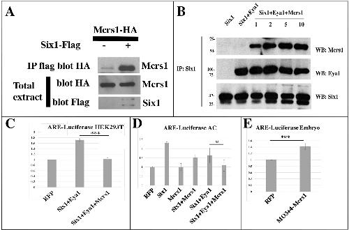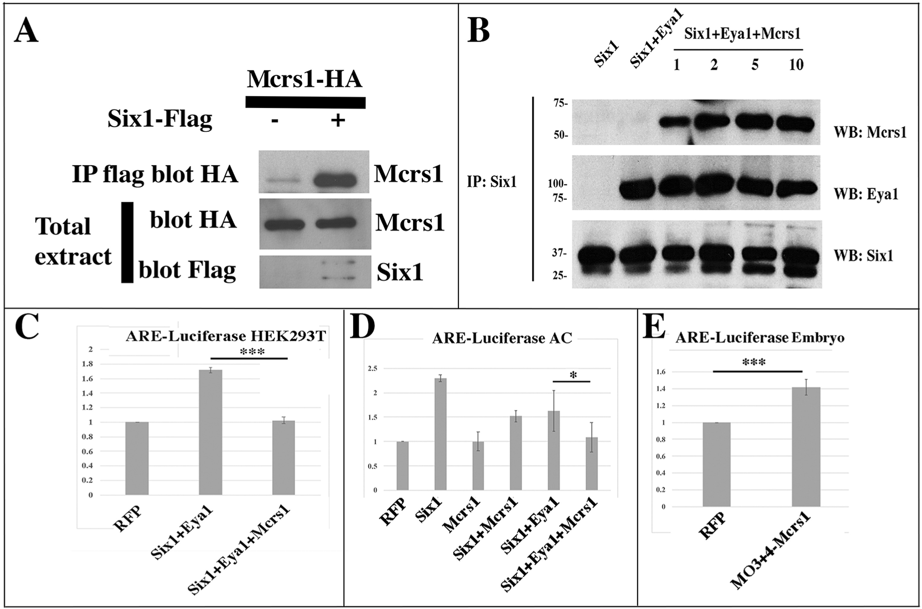 Fig. 1. Mcrs1 binds to Six1 and reduces Six1/Eya1 transcriptional activity. (A) HEK293T cells were transfected with either Six1-Flag alone or together with Mcrs1-HA. Six1-Flag efficiently immunoprecipitated Mcrs1. (B) HEK293T cells were transfected with either Six1-Flag alone (Six1) or together with Eya1-Myc (Six1+Eya1) plus various doses of Mcrs1-HA. Sequential Western blots were performed to detect Mcrs1 (anti-HA), Eya1 (anti-Myc) and Six1 (anti-Flag). Six1 immunoprecipitated Eya1, even in the presence of increasing amounts of Mcrs1 (1-, 2-, 5- or 10-fold greater than the amount of the Six1 plasmid), indicating that Mcrs1 does not displace Eya1 from the Six1 complex. (CâE) Dual glow luciferase assays using the ARE-luciferase reporter and pRL-CMV control reporter. Each value corresponds to the ratio between the firefly luciferase value and the Renilla value, normalized to the control plasmid (Red Fluorescent Protein, RFP). (C) HEK293T cells transfected with either RFP (control), Six1+Eya1 or Six1+Eya1+Mcrs1 plasmids. The addition of Mcrs1 significantly reduced Six1+Eya1 transcriptional activation (âââ, p â< â0.001, two-tailed t-test). Bars are the mean of at least 3 independent experiments â± âSD. (D) One-cell embryos were injected with 10 âpg of ARE-luciferase and 2.5 âpg of pRL-CMV plasmids, together with either RFP plasmid or a combination of mRNAs encoding Six1 (100 âpg), Eya1 (100 âpg) and/or Mcrs1 (200 âpg). Animal cap explants (AC) were dissected at blastula stages and cultured until control sibling embryos reached the early neurula stage. Individual animal caps were extracted and firefly and Renilla luciferase measured. The addition of Mcrs1 significantly reduced Six1+Eya1 transcriptional activation (â, p â< â0.05, two-tailed t-test). Bars are the mean of at least 3 independent experiments â± âSD. (E) Embryos at the 8-cell stage were injected with either 10 âpg of ARE-luciferase and 2.5 âpg of pCS2-Renilla plasmids plus 200 âpg of RFP mRNA alone or with Mcrs1 MO3+4 (2.5 âng each). Individual embryos (n â= â5) with fluorescence in the anterior neural plate were extracted and firefly and Renilla luciferase measured. Knock-down of endogenous Mcrs1 resulted in a significant increase in reporter activity (âââ, p â< â0.001, two-tailed t-test) due to endogenous Six1. Bars are the mean of at least 3 independent experiments â± âSD. |