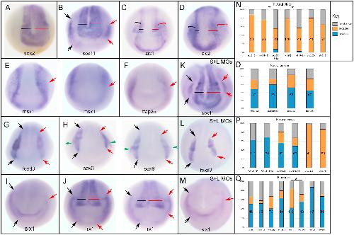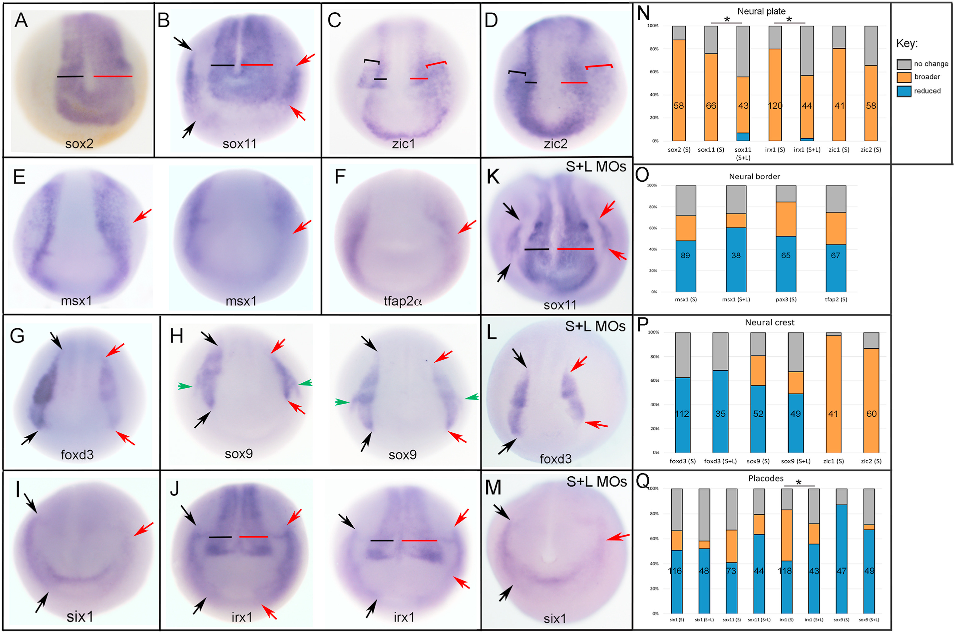 Fig. 2. Mcrs1 is required for properly proportioning the cranial neural gene expression domains. (A) sox2 expression in the neural plate is expanded on the S-MO injected side of the embryo (red bar), compared to control, uninjected side (black bar). (B) sox11 expression in the neural plate is expanded on the S-MO injected side of the embryo (red bar), compared to control, uninjected side (black bar). In this embryo, the sox11 PPE domain on the S-MO injected side (between red arrows) is reduced compared to the control, uninjected side (between black arrows). (C) zic1 expression in the lateral neural plate is expanded on the S-MO injected side of the embryo (red bar), compared to control, uninjected side (black bar). In this embryo, the neural crest domain (red bracket) also is expanded compared to control, uninjected side (black bracket). (D) zic2 expression in the lateral neural plate is expanded on the S-MO injected side of the embryo (red bar), compared to control, uninjected side (black bar). In this embryo, the neural crest domain (red bracket) also is expanded compared to control, uninjected side (black bracket). (E) Two examples of the effect of Mcrs1 knock-down by S-MOs on msx1 expression. In the left image, knock-down results in expansion of the msx1 domain (red arrow) and in the right image, in the diminution of the msx1 signal (red arrow). (F) In this example, tfap2α expression is reduced on the S-MO injected side of the embryo (red arrow). (G) foxd3 expression is reduced on the S-MO injected side of the embryo (between red arrows) compared to control side (between black arrows). (H) Two examples of the effect of Mcrs1 knock-down by S-MOs on sox9 expression. In the left image, knock-down results in a smaller neural crest domain of sox9 (between red arrows), and in the right image, in the diminution of the sox9 signal (between red arrows) compared to control, uninjected sides (between black arrows). In the left image, sox9 otic placode expression (small green arrows) is the same on both sides of the embryo, whereas in the right image it is diminished on the S-MO side (right side of image). (I) six1 expression is reduced on the S-MO injected side of the embryo (red arrow) compared to control side (between black arrows). (J) Two examples of the effect of Mcrs1 knock-down on irx1 expression. In both cases, the neural plate expression is expanded on the S-MO injected side of the embryo (red bar), compared to control, uninjected side (black bar). In the left image, irx1 expression in the PPE on the S-MO injected side of the embryo (between red arrows) is expanded compared to the control, uninjected side (between black arrows). In the right image, it is reduced. (K) Mcrs1 knock-down by S â+ âL MOs results in a broader sox11 neural plate domain (red bar) compared to control side (black bar) and a narrower PPE domain (between red arrows) compared to control side (between black arrows). These are the same effects as with S-MOs (cf. Fig. 2B). (L) Mcrs1 knock-down by S â+ âL MOs results in a smaller foxd3 neural crest domain (between red arrows) compared to control side (between black arrows). This is similar to the effect of S-MOs (cf. Fig. 2G). (M) Mcrs1 knock-down by S â+ âL MOs results in a fainter six1 PPE domain (red arrow) compared to control side (between black arrows). This is similar to the effect of S-MOs (cf. Fig. 2I). (N) Mcrs1 knock-down primarily results in expansion of neural plate gene domains. For sox11 and irx1, the S â+ âL MOs (S â+ âL) resulted predominantly in broader phenotypes, similar to S-MOs (S), but significantly more embryos showed no change (â, p â< â0.05, Chi-square test). Numbers in each bar indicates sample sizes in N-Q. (O) Mcrs1 knock-down results in about 50% of embryos showing reduced domains of neural border genes, with a smaller frequency of embryos showing broader domains. For msx1, there was no significant difference between frequencies resulting from S-MOs compared to S â+ âL MOs (p â> â0.05, Chi-square test). (P) Mcrs1 knock-down results in broader zic1 and zic2 neural crest domains, but primarily reduction of foxd3 and sox9 neural crest domains. For foxd3 and sox9, there were no significant differences between frequencies resulting from S-MOs compared to S â+ âL MOs (p â> â0.05, Chi-square test). (Q) Mcrs1 knock-down results in about 50% of embryos showing reduced PPE domains of six1, sox11 and irx1, with a smaller frequency of embryos showing broader domains. In contrast, it results in a high frequency of reduction of the sox9 otic placode domain. Only for irx1 was there a significant difference between frequencies resulting from S-MOs compared to S â+ âL MOs. (â, p â< â0.05, Chi-square). |
