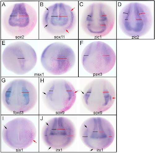 Genes referenced: cdca8 eya1 foxd3 irx1 mcrs1 msx1 myc pax3 prl rpn1 six1 sox11 sox2 sox9 tfap2a zic1 zic2