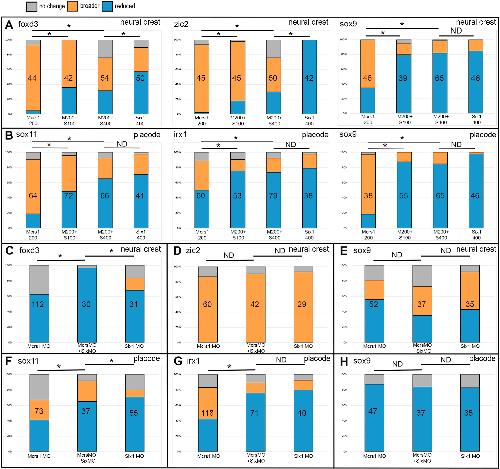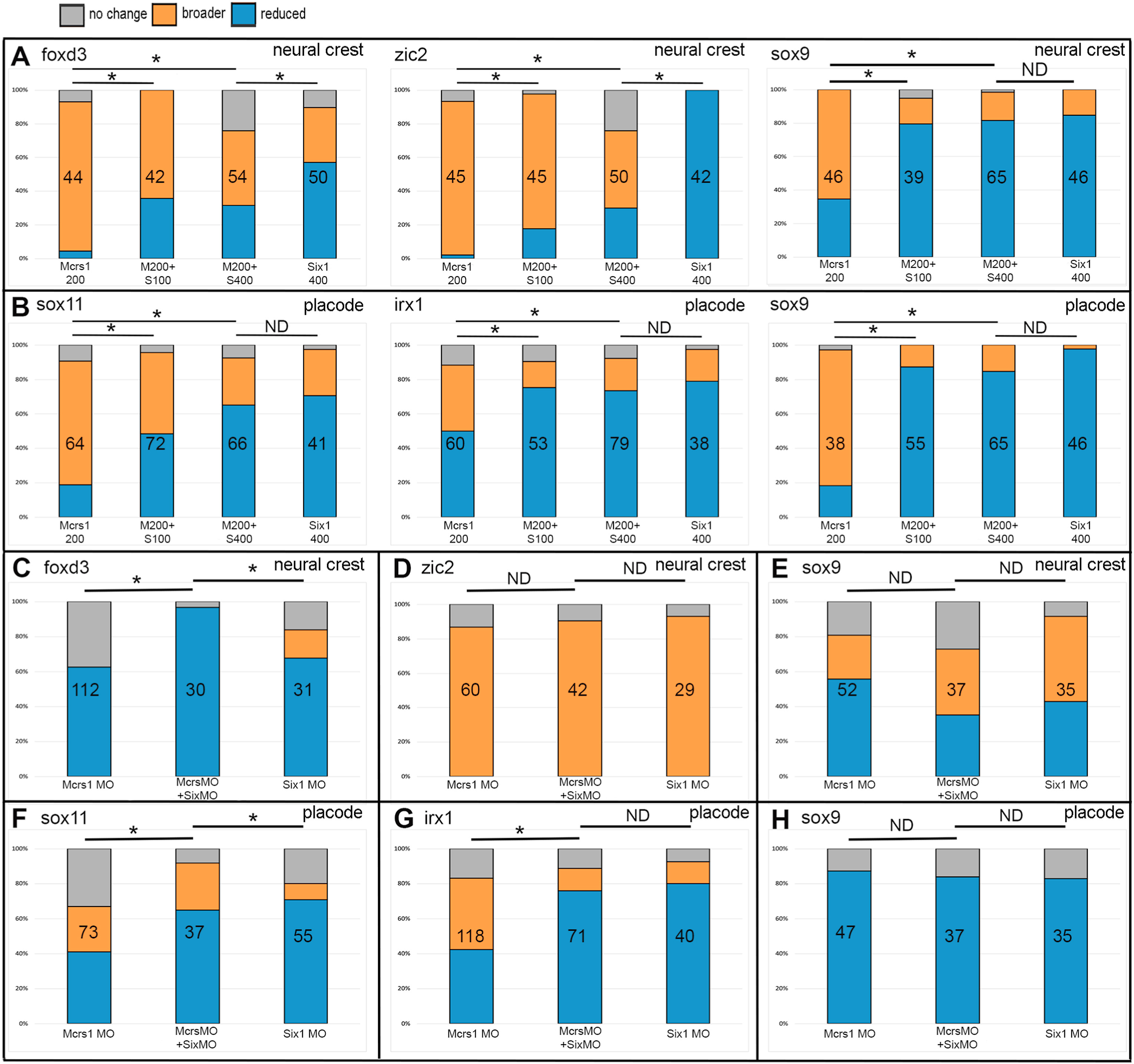 Fig. 5. Interactions between Mcrs1 and Six1 affect the sizes of the neural crest and PPE gene domains. (A) Frequencies of broader and reduced domains of three neural crest genes after co-expression of mRNAs. Mcrs1 200 â= â200 âpg of mcrs1 mRNA alone; M200+S100 â= â200 âpg of mcrs1 plus 100 âpg of six1 mRNAs; M200+S400 â= â200 âpg of mcrs1 plus 400 âpg of six1 mRNAs; Six1 400 â= â400 âpg of six1 mRNA alone. â, p â< â0.05, Chi-square test; ND, no difference. Numbers inside of each bar indicate the number of embryos analyzed. (B) Frequencies of broader and reduced domains of three placode genes after co-expression of mRNAs. Labels as in (A). (CâH) Frequencies of broader and reduced neural crest domains of foxd3 (C), zic2 (D), sox9 (E), and placode domains of sox11 (F), irx1 (G) and sox9 (H) after single knock-down (Mcrs1 MO; Six1 MO) or double knock-down (McrsMO â+ âSixMO). â, p â< â0.05, Chi-square test; ND, no difference. Numbers inside of each bar indicate the number of embryos analyzed. |