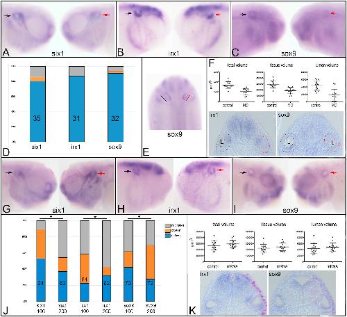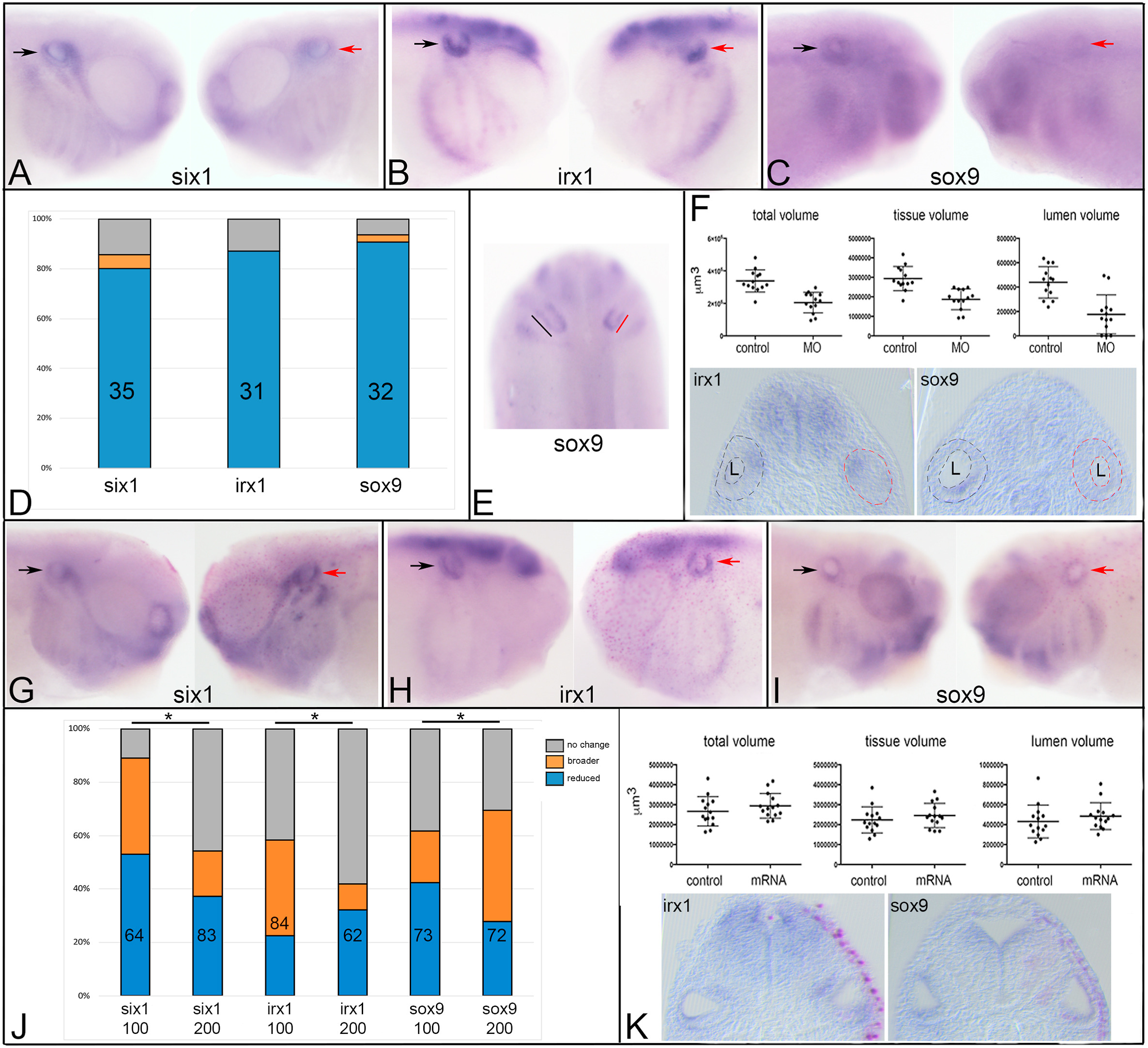 Fig. 7. Effects of altering Mcrs1 levels on otic vesicle gene expression and size. (A) Otic vesicles in larvae injected with Mcrs1 S-MOs primarily displayed lower intensity of six1 ISH signal. Black arrow â= âcontrol otic vesicle; red arrow â= âMcrs1 KD otic vesicle of same embryo. (B) Otic vesicles in larvae injected with Mcrs1 S-MOs primarily displayed lower intensity of irx1 ISH signal. Black arrow â= âcontrol otic vesicle; red arrow â= âMcrs1 KD otic vesicle of same embryo. (C) Otic vesicles in larvae injected with Mcrs1 S-MOs primarily displayed lower intensity of sox9 ISH signal. Black arrow â= âcontrol otic vesicle; red arrow â= âMcrs1 KD otic vesicle of same embryo. (D) The percent of embryos in which otic vesicle gene expression on the knock-down side was different from the control side of the same embryo. The otic expression of all three genes (six1, irx1, sox9) is primarily reduced (blue). Orange â= âpercent increased; gray â= âpercent no change. Numbers within the bars indicate sample sizes. (E) In tailbud embryos, sox9 expression indicates that the otic tissue is smaller on the Mcrs1 knock-down side (red bar) compared to control side (black bar). (F) Otic vesicle volumes (top) were calculated from serial sections of larvae (bottom) at the same stages as in A-C. Total volume was calculated within the outer dashed line, lumen (L) volume within the inner dashed line, and tissue volume between the two dashed lines. For each measurement, the volume of the Mcrs1 knock-down side (MO, red dashed lines) was significantly smaller compared to the control side (black dashed lines) of the same embryo. (total, p â= â0.00002; tissue, p â= â0.00004; lumen, p â= â0.0009; two-tailed, paired t-test, n â= â13).(G) An example of six1 otic vesicle expression that is more intense on the mcrs1-injected side (red arrow; 100 âpg mRNA) compared to the control side (black arrow) of the same larva.(H) An example of irx1 otic vesicle expression that is similar on the mcrs1-injected side (red arrow; 200 âpg mRNA) and control side (black arrow) of the same larva. (I) An example of sox9 otic vesicle expression that is similar on the mcrs1-injected side (red arrow; 100 âpg mRNA) compared to the control side (black arrow) of the same larva. (J) The percent of embryos in which otic vesicle gene expression on the mRNA-injected side was different from the control side of the same embryo. The otic expression for all three genes (six1, irx1, sox9) are a mixture of reduced (blue), broader (orange) and no change (gray). Two different concentrations of mRNA (100 âpg, 200 âpg) were analyzed, and for each there were significant differences in the frequencies of the phenotypes (six1, p â= â0.00002; irx1, p â= â0.0015; sox9, p â= â0.0117; Chi-square test). Numbers within the bars indicate sample sizes. (K) Otic vesicle volumes (top) were calculated from serial sections (bottom) of larvae (same stages as in G-I). There were no significant differences in total volume, tissue volume or lumen volume between mcrs1 mRNA-injected (pink lineage label) side versus control side of the same embryo (p â< â0.05, paired, two-tailed t-test; n â= â14 embryos). |