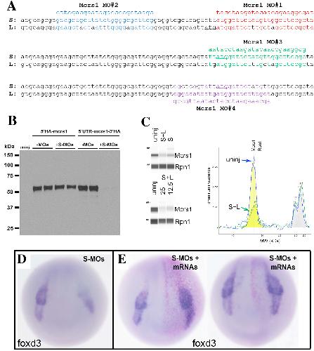Fig. S1. Efficacy and specificity of antisense morpholino oligonucleotide knock-down of Mcrs1. (A) Sequences of the 5â² ends of the short (S) and long (L) homeologs of Xenopus laevis mcrs1 mRNA. In each line the translational start site (atg) is underlined. The sequences of MO#1 and MO#2, which are completely complimentary to S-mcrs1, are shown in the top line; there are a few mismatches (in black letters) with L-mcrs1. Together, MO#1+MO#2 are referred to as S-MOs. A second set of MOs (MO#3 and MO#4) were designed to block the translation of both S-mcrs1 (middle line) and L-mcrs1 (bottom line) when injected together; the few mismatches are indicated by black letters. Together, MO#3+MO#4 are referred to as S â+ âL MOs. (B) Oocytes were microinjected with S-MOs and either 5â²HA-mcrs1 mRNA (MO-insensitive) or 5â²UTR-mcrs1-3â²HA mRNA (MO sensitive), incubated overnight, and Western blot analysis performed with an anti-HA antibody. Translation of 5â²UTR-mcrs1-3â²HA, which has the same 5â² sequence as endogenous S-mcrs1 mRNA (Figure S1A), is efficiently blocked by S-MOs (+S-MOs lanes). In contrast, translation of 5â²HA-mcrs1, which is missing the 5â² UTR site of MO#1 and whose site for MO#2 is too distant from the translation start site of the HA tag to effectively block translation, is not hindered by the presence of S-MOs. Thus, it can be used as a rescue construct (see Figure S1D). -MOs â= âno MOs injected, indicting efficient translation; uninj â= âuninjected oocytes that do not express HA. (C) Efficacy of the Mcrs1 MOs to knockdown endogenous Mcrs1 protein. Capillary western blot was used to detect endogenous Mcrs1 using a rabbit anti-MCRS1/MSP58 polyclonal antibody (Abcam, ab247013). Top left panel: both sets of MOs (S â+ âL; S) decreased endogenous Mcrs1 levels, compared to uninjected embryo (uninj), by more than 50% at 12.5ng/embryo. Bottom left panel: The decrease was even greater with 25ng/embryo of S â+ âL MOs. Right panel: An example of quantitative Western blot showing signal for uninjected embryo (uninj, blue trace and arrowhead, 2 âs exposure) compared to embryo injected with S â+ âL MOs (green trace and arrowhead, 2 âs exposure). The area under the curve was calculated and normalized to the signal obtained with the Rpn1 antibody in the same sample. (D) Embryo in which S-MOs were injected on one side (right side of image), raised to a neural plate stage and processed for ISH detection of foxd3 expression. Control expression is shown on the left side of the image. S-MOs cause significant reduction in foxd3 expression in 63% of embryos (n â= â112). (E) Two embryos in which S-MOs were injected on one side (right side of image), followed by injection of mRNAs: 5â²HA-mcrs1 mRNA, which is insensitive to MO knock down (Fig. S1B), and βgal mRNA, which is a lineage tracer (pink nuclei). Control foxd3 expression is shown on the left side of each image. Expression of foxd3 is restored in 86.4% of embryos when MO-insensitive mcrs1 mRNA is supplied (n â= â59). |