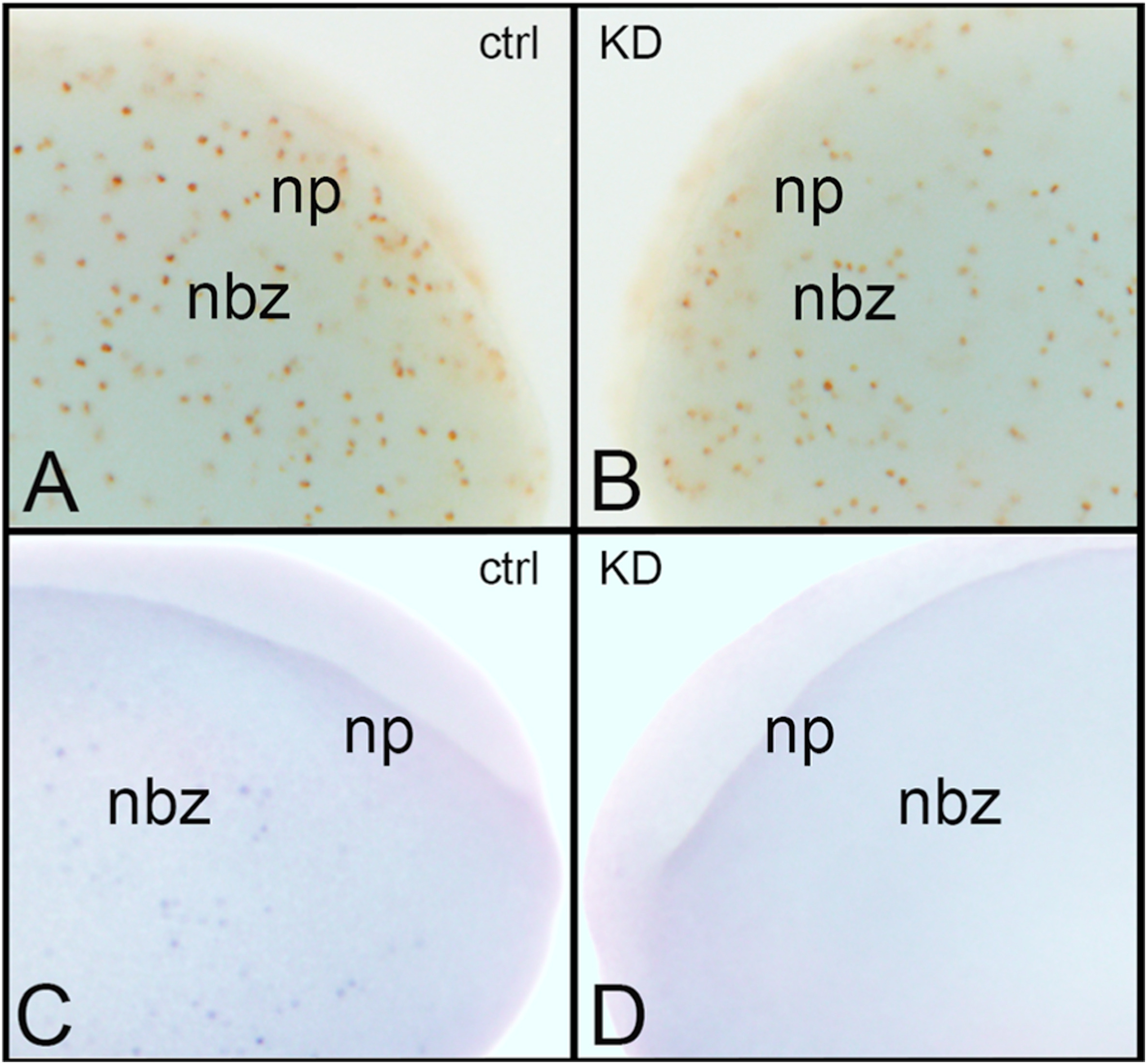 Fig. 3. Mcrs1 knock-down reduces apoptosis but does not affect proliferation. (A) Side view of stage 16 embryo (anterior to right, dorsal to top) showing pH3-labeled nuclei (brown) in the rising folds of the neural plate (np) and neural border zone (nbz) on the control (ctrl) side. (B) Side view of the same embryo (anterior to left, dorsal to top) on the S-MOs injected (KD) side. (C) Side view of stage 16 embryo (anterior to right, dorsal to top) showing TUNEL-labeled nuclei (dark blue) in the rising folds of the neural plate (np) and neural border zone (nbz) on the control (ctrl) side. (D) Side view of the same embryo (anterior to left, dorsal to top) on the S-MOs injected (KD) side. |