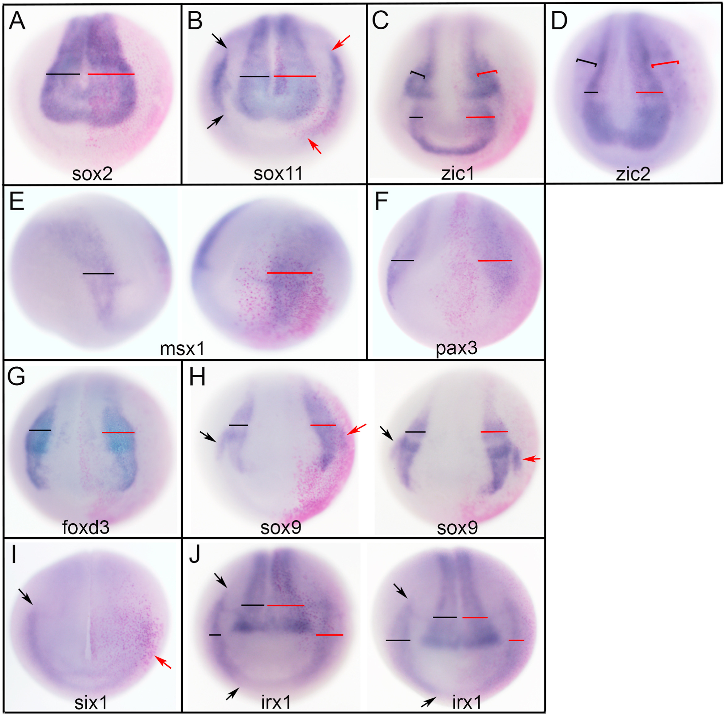 Fig. 4. Increased levels of Mcrs1 expands neural plate and neural crest domains. (A) sox2 expression in the neural plate is expanded on the mcrs1 injected side of the embryo (red bar), compared to control, uninjected side (black bar). Pink dots are βGal-lineage labeled cells that received the injected mRNAs. (B) sox11 expression in the neural plate is expanded on the mcrs1 injected side of the embryo (red bar), compared to control, uninjected side (black bar). In this embryo, the sox11 PPE domain on the mcrs1 injected side (between red arrows) is expanded compared to the control, uninjected side (between black arrows). (C) zic1 expression in the lateral neural plate is expanded on the mcrs1 injected side of the embryo (red bar), compared to control, uninjected side (black bar). The neural crest domain (red bracket) also is expanded. (D) zic2 expression in the lateral neural plate is expanded on the mcrs1 injected side of the embryo (red bar), compared to control, uninjected side (black bar). The neural crest domain (red bracket) also is expanded. (E) msx1 expression along the border of the neural plate is expanded on the mcrs1 injected side of the embryo (red bar in right image), compared to control, uninjected side of the same embryo (black bar in left image). (F) pax3 expression along the border of the neural plate is expanded on the mcrs1 injected side of the embryo (red bar), compared to control, uninjected side (black bar). (G) foxd3 expression is expanded on the mcrs1 injected side of the embryo (red bar) compared to control, uninjected side (black bar). (H) Two examples of sox9 expression after increased Mcrs1. In both embryos, the neural crest domain is broader on the mcrs1 injected side (red bars) compared to control, uninjected side (black bar). In the left image, otic placode domain (red arrow) is smaller, whereas in in the right image it is larger (red arrow), compared to control, uninjected sides (black arrows). (I) six1 expression is reduced on the mcrs1 injected side of the embryo (red arrow) compared to control side (black arrow). (J) Two examples of irx1 expression after increased Mcrs1. In both cases, the neural plate expression is expanded on the mcrs1 injected side of the embryo (red bar), compared to control, uninjected side (black bars). In the left image, irx1 expression in the PPE on the mcrs1 injected side of the embryo is expanded (red bar) compared to the control, uninjected side (black ba). In the right image, it is reduced. |
