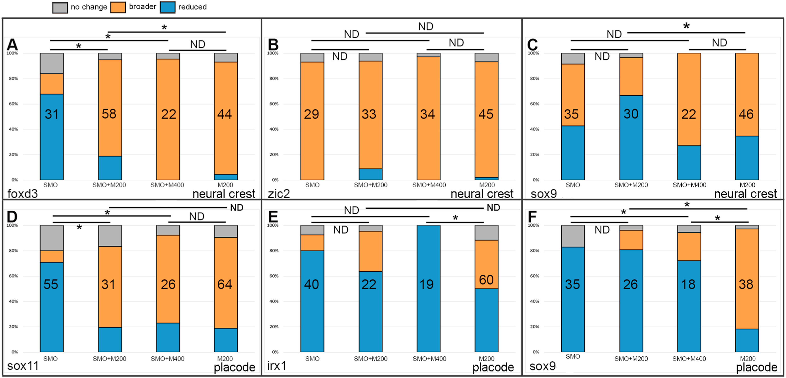 Fig. 6. Some of Mcrs1 gain-of-function effects on gene expression are independent of the presence of Six1. Mcrs1 levels were increased by microinjections of either 200 âpg (M200) or 400 âpg (M400) mRNA in wild type embryos or in Six1 morphants (SMO) to test whether Six1 knock-down alters the frequencies in neural crest gene domains (AâC) or PPE gene domains (DâF). (A) Knock-down of Six1 alone (SMO) reduced the foxd3 neural crest domain at high frequency, whereas adding Mcrs1 made the domain broader, even in the absence of Six1. (B) Knock-down of Six1 and increased Mcrs1 both primarily expanded the zic2 neural crest domain; the frequencies were not significantly different (ND, p â> â0.05, Chi-square test) between the different experimental conditions. (C) The frequencies of the effects of Six1 knock-down versus increased Mcrs1 alone on the sox9 neural crest domain were indistinguishable. However, Six1 knock-down significantly decreased the ability of 200 âpg of mcrs1 mRNA to broaden this domain (â, p â= â0.0149, Chi-square test). (D) Knock-down of Six1 alone reduced the sox11 PPE domain at high frequency, whereas adding Mcrs1 made the domain broader, even in the absence of Six1 (â, p â= â0.00001, Chi-square test). (E) Knock-down of Six1 alone reduced the irx1 PPE domain at high frequency, whereas adding Mcrs1 alone (M200) more frequently made the domain broader. Adding Mcrs1 to Six1 morphants did not significantly change phenotype frequencies compared to Six1 KD alone; surprisingly, Six1 knockdown with 400 âpg mcrs1 mRNA was significantly different from M200 (â, p â= â0.004, Chi-square test). (F) Knock-down of Six1 alone reduced the sox9 otic placode domain at high frequency, whereas adding Mcrs1 alone (M200) predominantly made the domain broader. Six1 KD significantly reduced the ability of Mcrs1 to broaden the domain (â, p â< â0.001, Chi-square test). Numbers inside of each bar indicate the number of embryos analyzed. |