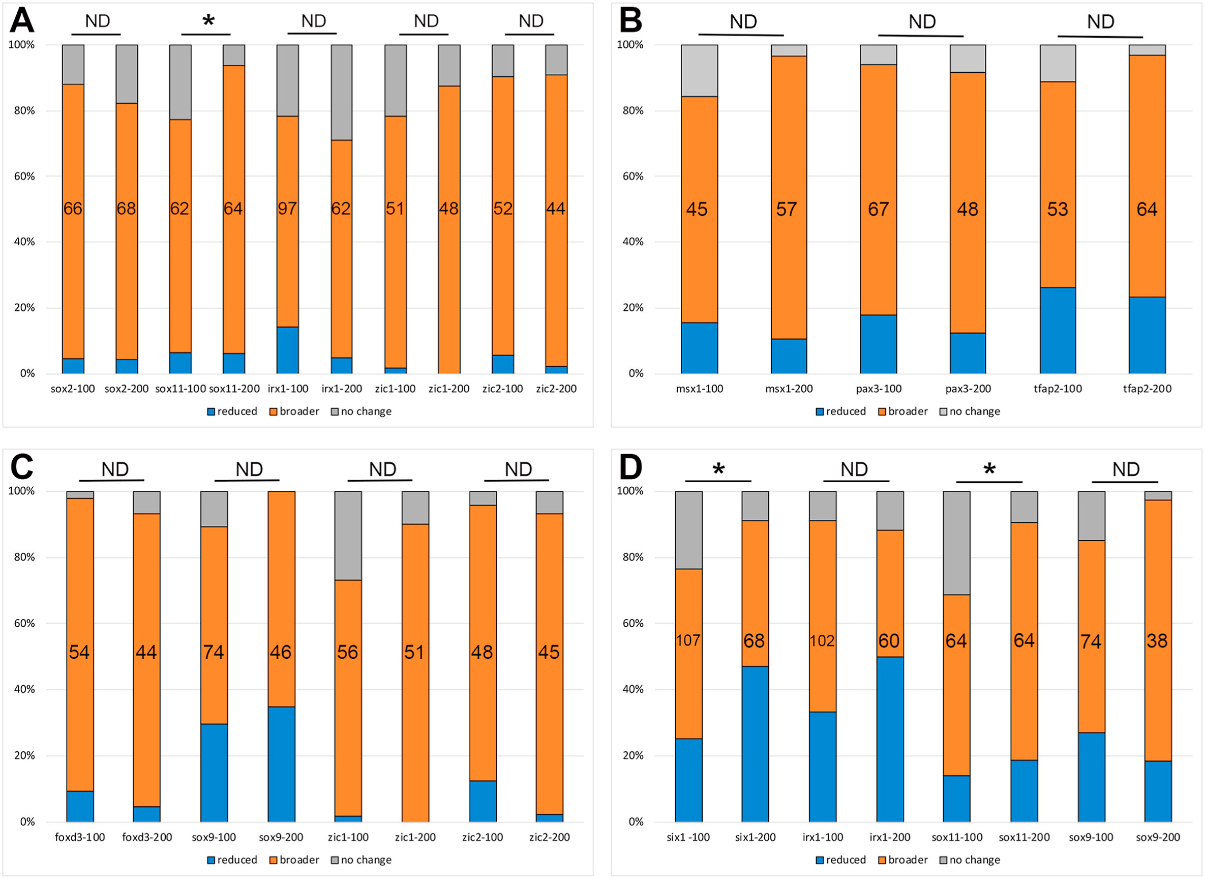 Fig. S2. Frequencies of expression domain changes after increasing levels of Mcrs1. (A) Increased Mcrs1 predominantly results in broader domains of neural plate genes. Frequencies significantly differed between 100 âpg and 200 âpg of mcrs1 mRNA only for sox11 (p â= â0.031, ND, p â> â0.05, Chi-square test). (B) Increased Mcrs1 predominantly results in broader domains of neural border genes, with no significant difference between 100 âpg and 200 âpg of mcrs1 mRNA (ND, p â> â0.05, Chi-square test). (C) Increased Mcrs1 predominantly results in broader domains of neural crest genes, with no significant difference 100 âpg and 200 âpg of mcrs1 mRNA (ND, p â> â0.05, Chi-square test). (D) Increased Mcrs1 results in broader domains of PPE/placode genes in the majority of cases, with no significant difference 100 âpg and 200 âpg of mcrs1 mRNA for irx1 and sox9. However, compared to 100 âpg of mcrs1 mRNA, 200 âpg causes significantly fewer embryos to have a broader six1 domain (p â= â0.0035) and significantly more to have a broader sox11 domain (p â= â0.0088, ND, p â> â0.05, Chi-square test). |