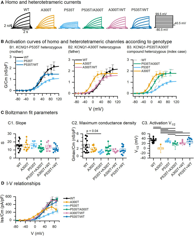 Figure 1. Activation parameters of homo and heterotetrameric channels. (A) Exemplar current traces resulting from co-expression of minK and WT, A300T and/or P535T Kv7.1 α subunits. (B) Activation curves obtained from tail currents. Circles represent mean ± SEM values and lines represent Boltzmann equation fits. (C) Boltzmann fit parameters for tetrameric channels. Empty circles represent means and boxes represent SEM values; full circles represent raw data. (D) Averaged steady-state I–V relationships of tetrameric channels. All differences marked in C1 were significant, p values for significant differences in C1 and D are shown in Table 1. Conductance-voltage (G-V) curves fitted to averaged data from WT (n = 13), A300T (n = 10), P535T (n = 6), P535T/A300T (n = 14), A300T/WT (n = 7), and P535T/WT (n = 11) cells.