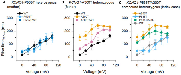Figure 2. Rise time300ms of homo and heterotetrameric channels. (A) P535T (n = 6) and P535T/WT (n = 7) currents shared similar rise-time300ms values with WT (n = 13) currents. (B) A300T (n = 5) and A300T/WT (n = 8) currents were significantly slower than WT currents. (C) A300T and P535T/A300T (n = 8) currents were significantly slower than P535T and WT currents. WT rise-time300ms values are shown in gray for comparison only.