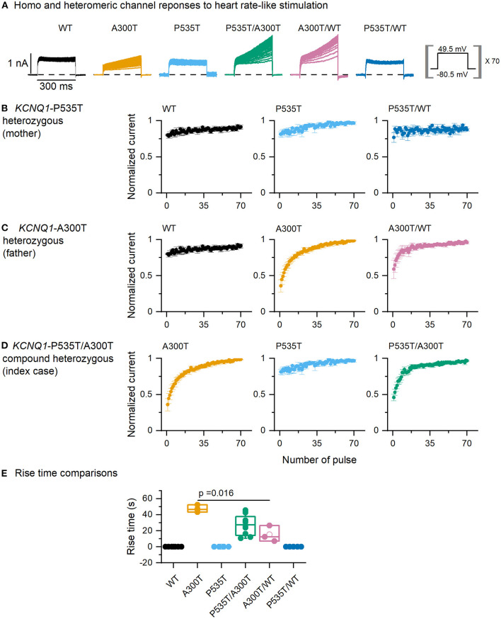 Figure 3. Current responses to normal heart rate-like stimulation. (A) Currents from homo and heterotetrameric channels. (B–D) End-step normalized current as a function of step number for P535T heterozygous (WT, P535T, and P535T/WT channels, all curves were similar), A300T heterozygous (WT and A300T and A300T/WT channels) and P535T/A300T compound heterozygous (P535T, A300T, and P535T/WT channels) genotypes. (E) Rise-time comparisons for A300T-containing channels. Empty circles represent mean values, boxes represent SEM values; full circles represent raw data from WT (n = 6), A300T (n = 3), P535T (n = 4), P535T/A300T (n = 8), A300T/WT (n = 3), and P535T/WT (n = 5) cells.