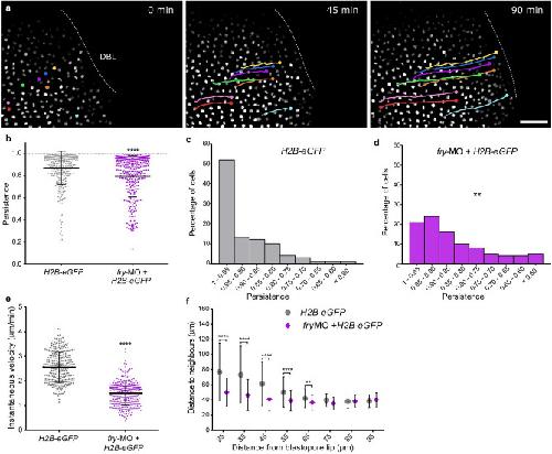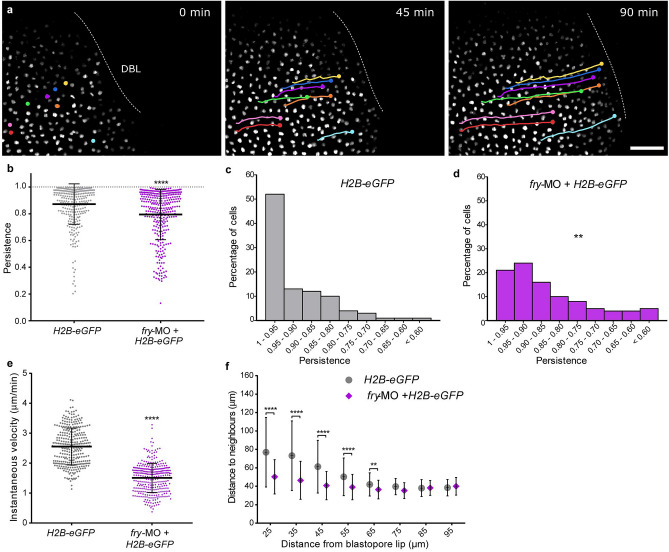 Figure 4. Fry depletion affects the motion of superficial involuting marginal zone cells. (a) Xenopus 4-cell stage embryos were dorsally injected with H2B-eGFP mRNA with or without fry-MO (15 ng) and mounted for light-sheet fluorescence microscopy at the beginning of gastrulation (St. 10). Time lapse movies were recorded during gastrulation and individual cells were tracked while moving toward the dorsal blastopore lip (DBL) (e.g. nuclei in color. Circles and lines indicate nuclei position and trajectory, respectively). H2B-eGFP mRNA (Nâ=â5; total number of tracked cellsâ=â319); H2B-eGFP mRNAâ+âfry-MO injected embryos (Nâ=â5; total number of tracked cellsâ=â332). N: number of independent experiments. Representative images from time-lapse movies at selected time-points (t) are shown. Scale bar: 100 μm. (b) Individual cell persistence measurements were calculated as the ratio between the linear distance traveled by the cell and the total length of its path. Each point represents a single cell. Statistical significance was evaluated using two-tailed Mann Whitney U-test. ****pâ<â0.0001 indicates statistically significant differences between groups. The mean and standard deviation are indicated. (c) Histogram representing the percentage of cells from control embryos (H2B-eGFP) for the different persistence intervals. (d) Histogram representing the percentage of cells from fry-MOâ+âH2B-eGFP embryos for the different persistence intervals. Statistical significance was evaluated using Chi-square test. **pâ<â0.001 indicates statistically significant differences were found between groups. (e) Individual cell instantaneous velocity measurement. The mean and standard deviation are indicated. Each point represents a single cell. Statistical significance was evaluated using two-tailed Mann Whitney U-test. ****pâ<â0.0001 indicates statistically significant differences between groups. (f) Average distance from each cell nucleus to the nearest neighbors for all cells within a certain distance region from the blastopore lip (region sizeâ=â30 μm; overlapping region sizeâ=â5 μm). Distance to neighbors was quantified from the 150 min time point onward (St. 11.5) of the movies shown in a. Number of cells in each window was always larger than 100 cells. Data in the graph is presented as means with standard deviation. Statistical significance was evaluated using KruskalâWallis test and Dunn's multiple comparisons test. ****pâ<â0.0001 and **pâ<â0.01 indicate statistically significant differences between groups. |