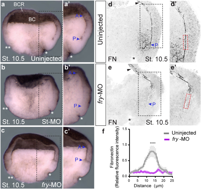 Figure 5. The cleft of Brachet and fibronectin fibrillar matrix formation are affected in fry-depleted embryos. (aâc) Formation of the cleft of Brachet on the dorsal side was analyzed in hemisected early gastrula stage embryos (St. 10.5). (a) Uninjected embryo (Nâ=â2, nâ=â26). (b) Standard Control morpholino (St-MO) (15 ng) injected embryo (Nâ=â2; nâ=â13). (c) fry-MO (15 ng) injected embryo (Nâ=â2; nâ=â25, in 92% of embryos, the cleft of Brachet is only present anteriorly). * indicates the position of the dorsal blastopore lip; ** indicates the ventral blastopore lip (morphological feature used as indication that embryos were developmentally synchronized at stage 10.5); blue arrowheads indicate the anterior (A) and posterior ends (P) of the cleft, BC: blastocoel; BCR: blastocoel roof. (aââcâ) Magnifications of the black-boxed area in panels a-c. Representative embryos are shown. (d,e) Hemisections of early gastrula stage embryos (St. 10.5) immunostained for fibronectin. (d) Uninjected embryo. (e) fry-MO (15 ng) injected embryo. Black arrowheads indicate fibronectin presence at the BCR. Blue arrowheads indicate the posterior end (P) of the cleft. (dâ,eâ) Magnifications of the black-boxed area in panels d and e. For fibronectin quantification, a rectangle 25 μm wide and 100 μm long was drawn at a distance of 300 μm from the dorsal blastopore lip (*) across the cleft of Brachet (red-boxed area). (f) Fibronectin abundance was quantified as fluorescence intensity across the 25 μm width of the red rectangle and normalized to the mean fluorescence (see Methods) in uninjected embryos (Nâ=â2; nâ=â7) and fry-MO (15 ng) injected embryos (Nâ=â2; nâ=â8). Data in the graph is presented as mean with standard error. Statistical significance was evaluated using two-tailed Mann Whitney U-test. **** pâ<â0.0001 indicates statistically significant differences between groups. |