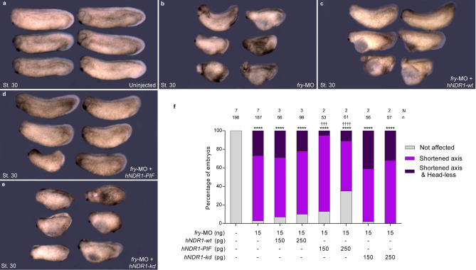 Supplementary Fig. S6. hNDR1-PIF rescues the chordamesoderm elongation in fry-depleted embryos. Neurula stage embryos (St. 15) were subject to in situ hybridization for notochord homeobox, not. Dorsal midline tissues elongation was measure as the length of not expression domain divided by the length of the whole-embryo of uninjected embryos, fry-MO (15 ng) injected embryos, fry-MO (15 ng) + hNDR1-wt mRNA (250 pg) coinjected embryos, fry-MO (15 ng) + hNDR1-PIF mRNA (250 pg) coinjected embryos, fry-MO (15 ng) + hNDR1-kd mRNA (250 pg) coinjected embryos. N: number of independent experiments, n: number of embryos. The stage of injected embryos was established based on the stage of uninjected littermates and confirmed by the presence of not expression in the anterior neuroectodermal domain. Data in the graphs is presented as means with standard deviation. Each point represents a single embryo. Statistical significance was evaluated using Kruskal-Wallis test and Dunn's multiple comparisons test (**** p<0.0001, â â p< 0.01). * represents the comparison to the uninjected group and â represents the comparison to the fry-MO injected group. |