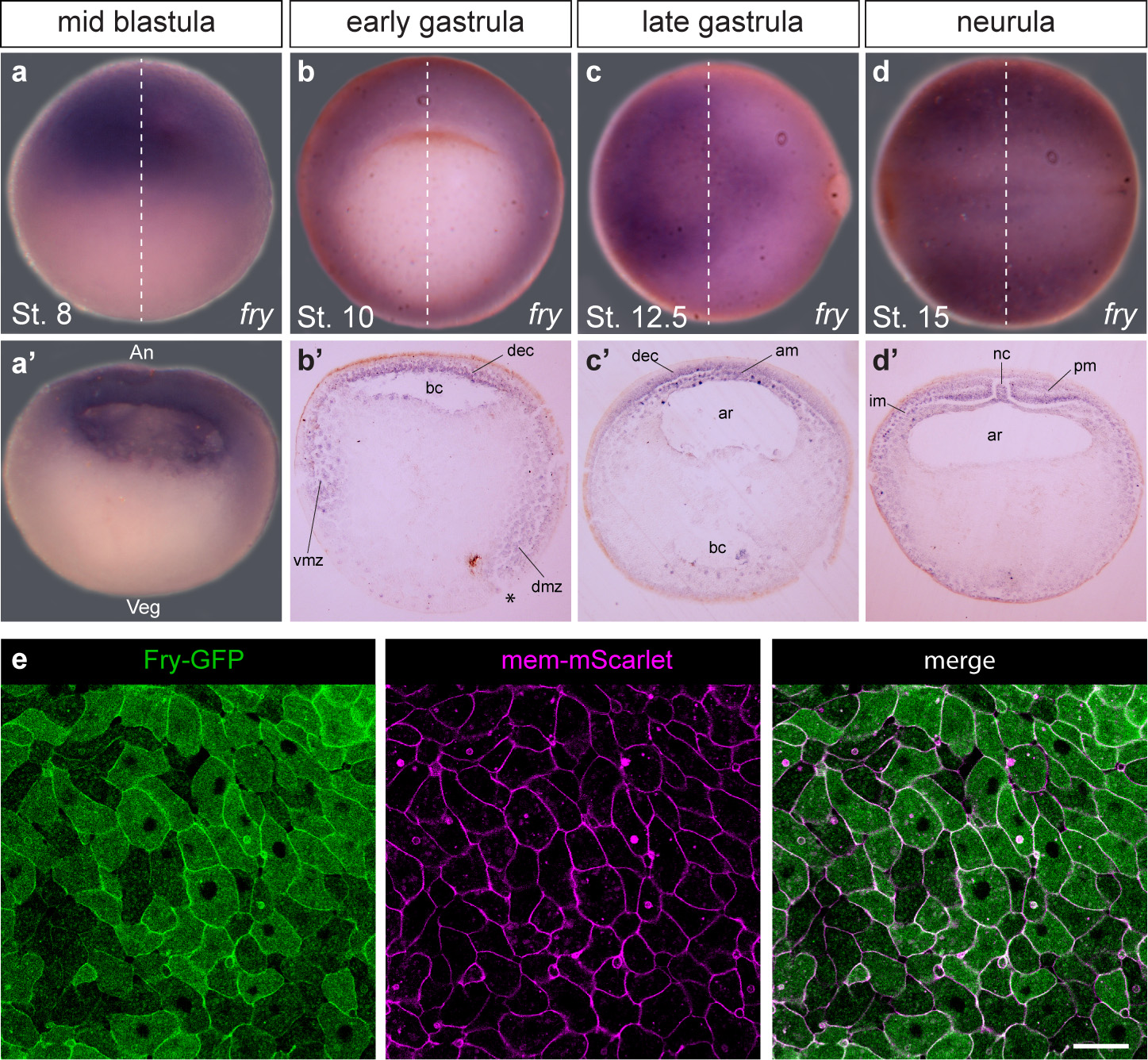 Supplementary Fig. S1. Fry expression and localization during gastrulation. (a-d) Fry expression in Xenopus embryos. (a) Mid blastula stage embryo (St. 8). Dotted lines indicate the orientation of the hemisection (lateral view, animal pole up). (aâ) Mid blastula stage embryo (St. 8) hemisection. Animal (An) and vegetal (Veg) poles are indicated. (b) Early gastrula stage embryo (St. 10.5) (vegetal view, dorsal up). (c) Late gastrula stage embryo (St. 12.5) (dorsal view). (c) Neurula stage embryo (St. 15) (dorsal view). Dotted lines indicate the orientation of the histological preparations showed in (bâ,câ,dâ). vmz: ventral marginal zone, dmz: dorsal marginal zone, bc: blastocoel, dec: deep layer of the ectoderm, am: axial mesoderm, ar: archenteron, nc: notochord, pm: paraxial mesoderm, im: intermediate mesoderm * indicates the position of the dorsal blastopore lip. Representative embryos are shown (e) Fry-GFP localization in dorsal mesoderm cells. Dorsal marginal zone explants were prepared from early gastrula embryos (St. 10.5) coinjected into both dorsal blastomeres of the 4-cell stage embryos with fry-GFP and mem-mScarlet mRNAs. Scale bar: 100 μm. A representative explant is shown (N = 2; n = 7) N: number of independent experiments, n: number of explants analyzed. |