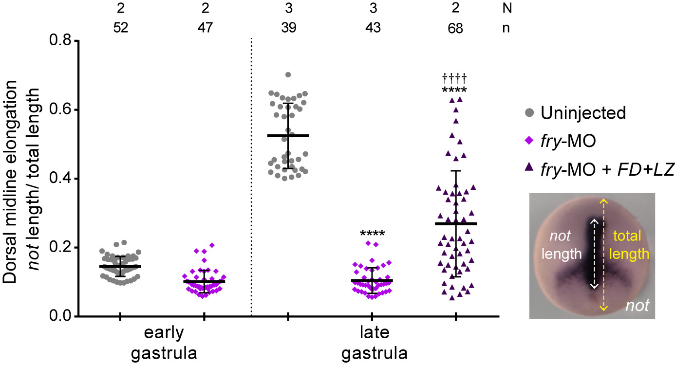 Supplementary Fig. S3. Chordamesoderm elongation requires Fry function. Embryos at different stages were subject to in situ hybridization for notochord homeobox, not. Dorsal midline tissues elongation was measure on uninjected embryos, fry-MO (15 ng) injected embryos and fry-MO (15 ng) + FD+LZ mRNA (800 pg) coinjected embryos at early gastrula stage (St. 10.5) and late gastrula stage (St. 13). Right: Scheme of the metrics used: ratio of not expression domain length (not length, white) over whole-embryo length (yellow). N: number of independent experiments, n: number of embryos. The stage of injected embryos was established based on the stage of uninjected littermates. Data in the graphs is presented as means with standard deviation. Each point represents a single embryo. Statistical significance was evaluated using Kruskal-Wallis test and Dunn's multiple comparisons test (****,â â â â p<0.0001). * represents the comparison to the uninjected group and â represents the comparison to the fry-MO injected group. |
