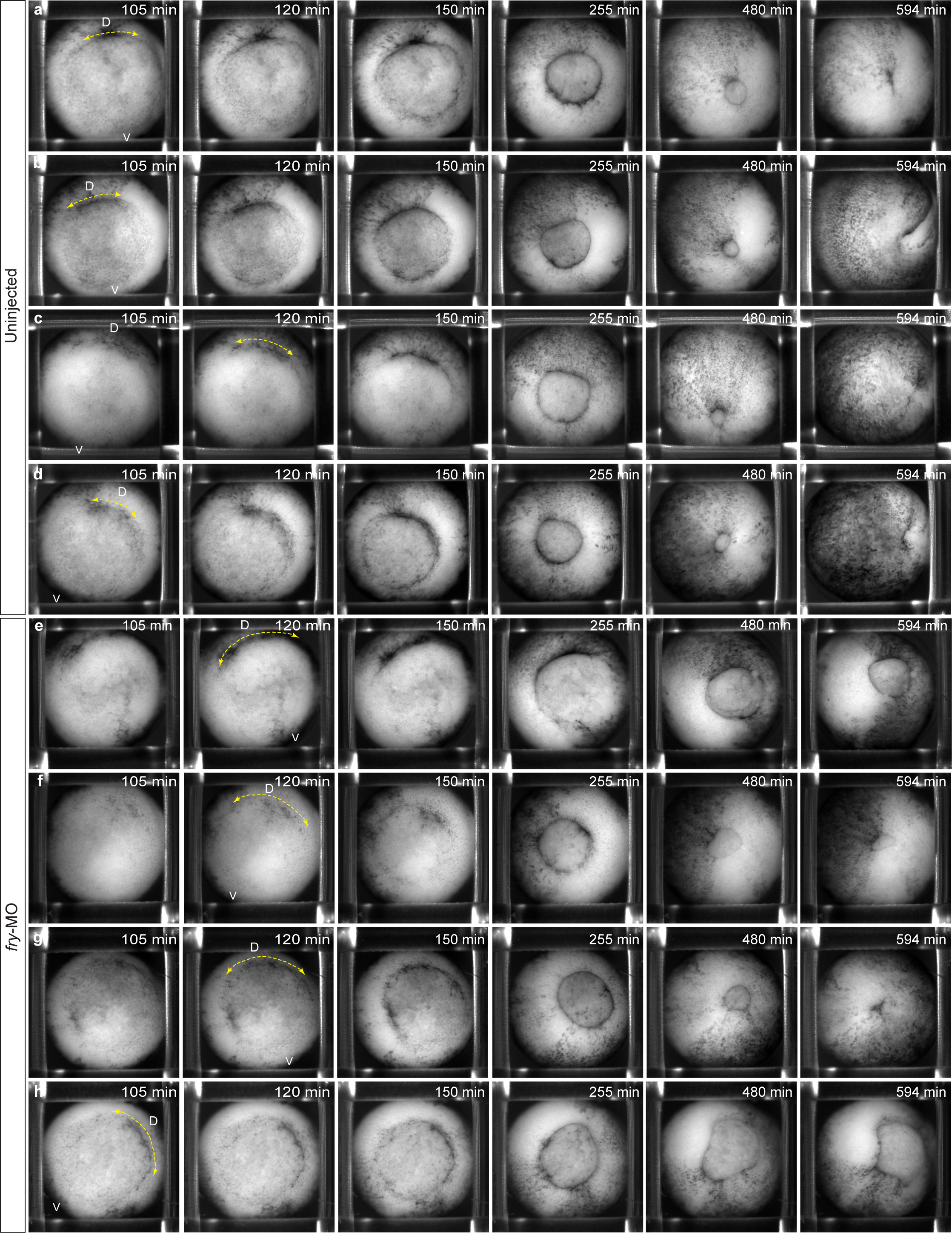 Supplementary Fig. S4. Blastopore formation and closure in fry-depleted embryos. Still frames from time-lapse movies (see Supplementary Movie S1) of gastrulating embryos at the indicated time-point (t) (vegetal view). Embryos were mounted at late blastula (St. 9) (t = 0). (a-d) Representative uninjected embryos (n = 12). (e-h) Representative fry-MO (15 ng) injected embryos (n = 12). Note that the blastopore formation is laterally expanded in fry-depleted representative embryos. Note all embryos present different degrees of blastopore closure delay. Only the embryo in h does not achieve blastopore closure. Dotted yellow arrows indicate the position and length of the dorsal blastopore lip when it is formed. D: dorsal; V: ventral. |