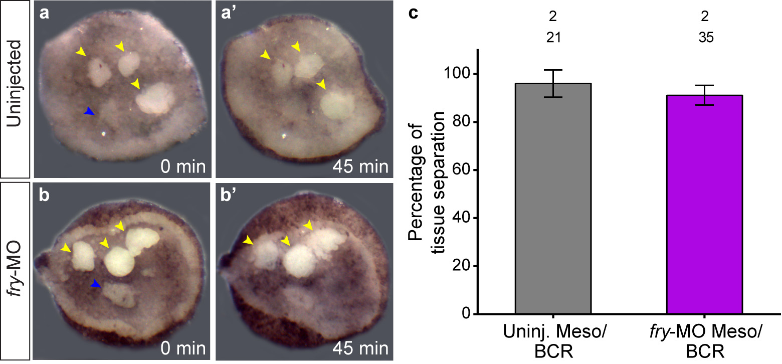 Supplementary Fig. S5. Fry depletion does not affect tissue separation behavior of dorsal mesoderm cells. (a,b) BCR assay for separation behavior in Xenopus embryos. Dorsal mesoderm test aggregates (yellow arrowheads) or deep layer of the ectoderm test aggregates (blue arrowheads) were prepared from uninjected (a) or fry-MO (15 ng) injected embryos (b) and placed on an uninjected explanted BCR. Representative aggregates are shown. Tissue separation behavior was evaluated at time (t) = 45 min (aâ,bâ). Test aggregates that remained on explanted BCR surface are indicated by arrowheads. Note that ectodermal aggregates sunk on the surface of the explanted BCR while dorsal mesoderm test aggregates remain on the surface. (c) Quantification of BCR assay: percentage of mesoderm aggregates that exhibited tissue separation behavior. Data in the graph is presented as means with standard deviation. N: number of independent experiments, n: number of mesoderm test aggregates. Statistical significance was evaluated using two-tailed Mann Whitney U-test. No statistically significant differences were found between groups (p = 0.4258). |