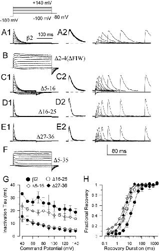Inactivation of BK channels by the NH2 terminus of the beta2 auxiliary subunit: an essential role of a terminal peptide segment of three hydrophobic residues.