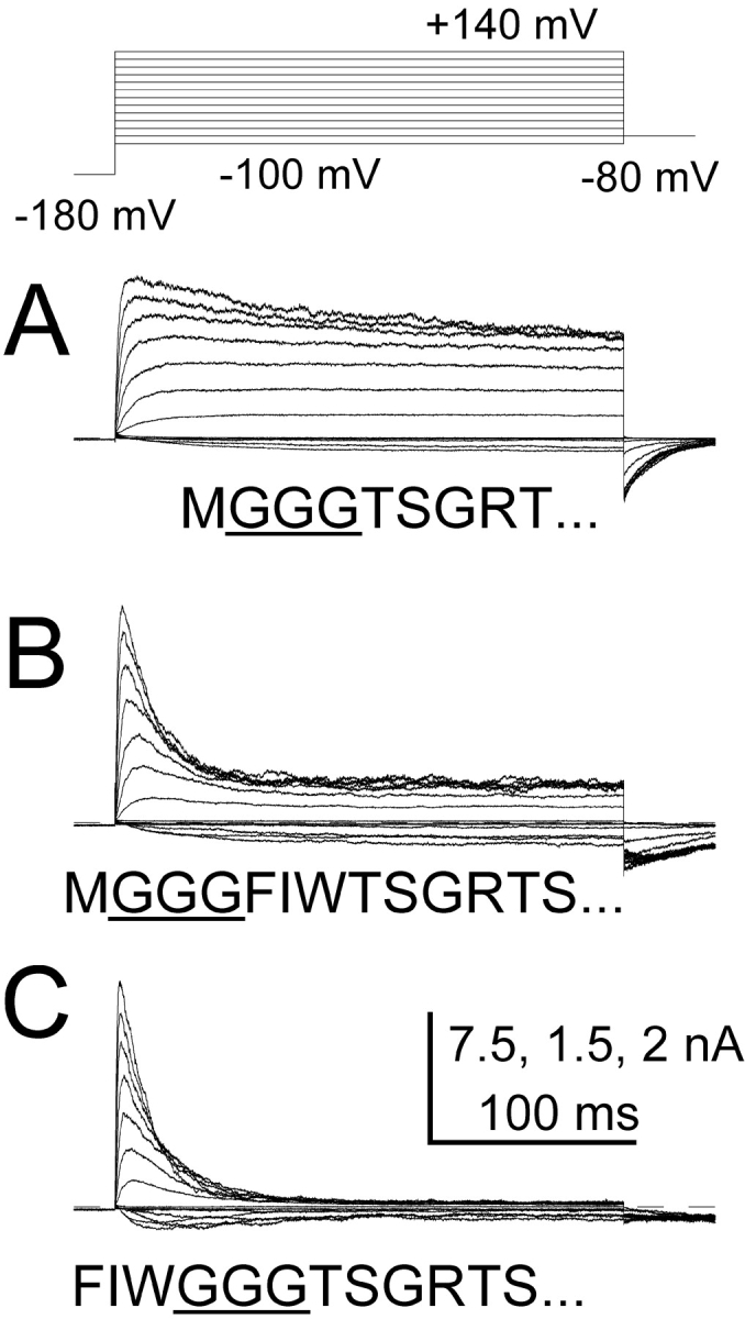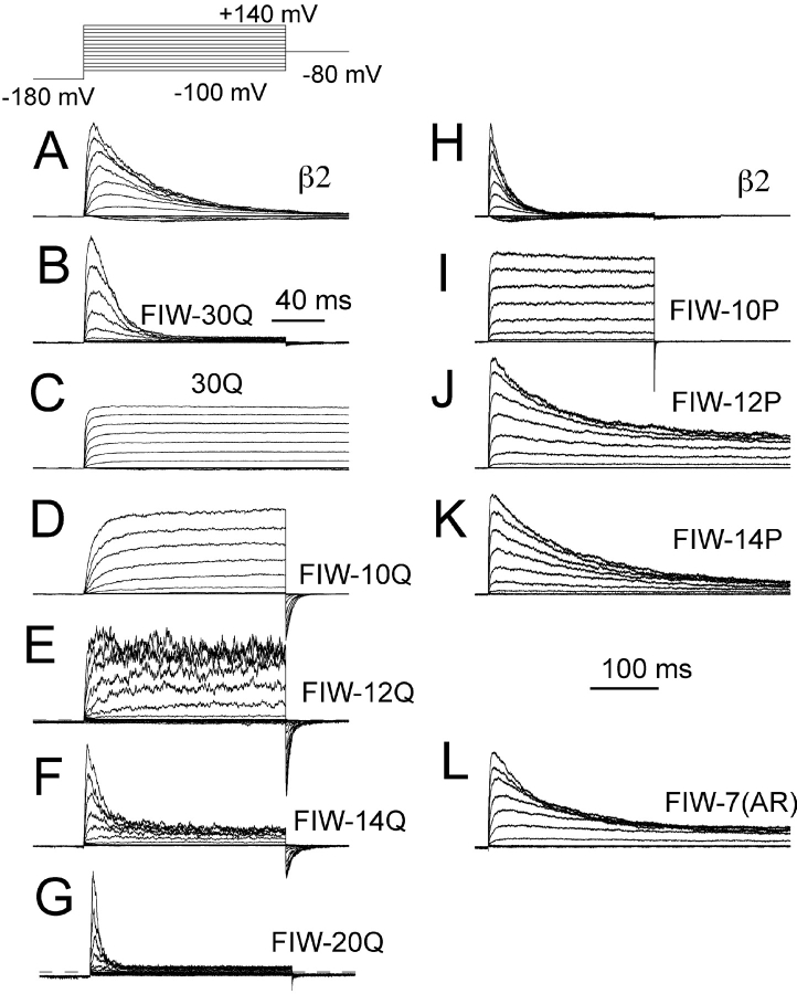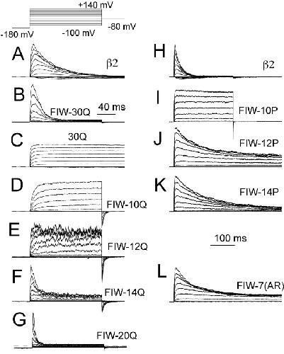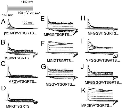 An auxiliary beta2 subunit, when coexpressed with Slo alpha subunits, produces inactivation of the resulting large-conductance, Ca(2+) and voltage-dependent K(+) (BK-type) channels. Inactivation is mediated by the cytosolic NH(2) terminus of the beta2 subunit. To understand the structural requirements for inactivation, we have done a mutational analysis of the role of the NH(2) terminus in the inactivation process. The beta2 NH(2) terminus contains 46 residues thought to be cytosolic to the first transmembrane segment (TM1). Here, we address two issues. First, we define the key segment of residues that mediates inactivation. Second, we examine the role of the linker between the inactivation segment and TM1. The results show that the critical determinant for inactivation is an initial segment of three amino acids (residues 2-4: FIW) after the initiation methionine. Deletions that scan positions from residue 5 through residue 36 alter inactivation, but do not abolish it. In contrast, deletion of FIW or combinations of point mutations within the FIW triplet abolish inactivation. Mutational analysis of the three initial residues argues that inactivation does not result from a well-defined structure formed by this epitope. Inactivation may be better explained by linear entry of the NH(2)-terminal peptide segment into the permeation pathway with residue hydrophobicity and size influencing the onset and recovery from inactivation. Examination of the ability of artificial, polymeric linkers to support inactivation suggests that a variety of amino acid sequences can serve as adequate linkers as long as they contain a minimum of 12 residues between the first transmembrane segment and the FIW triplet. Thus, neither a specific distribution of charge on the linker nor a specific structure in the linker is required to support the inactivation process.