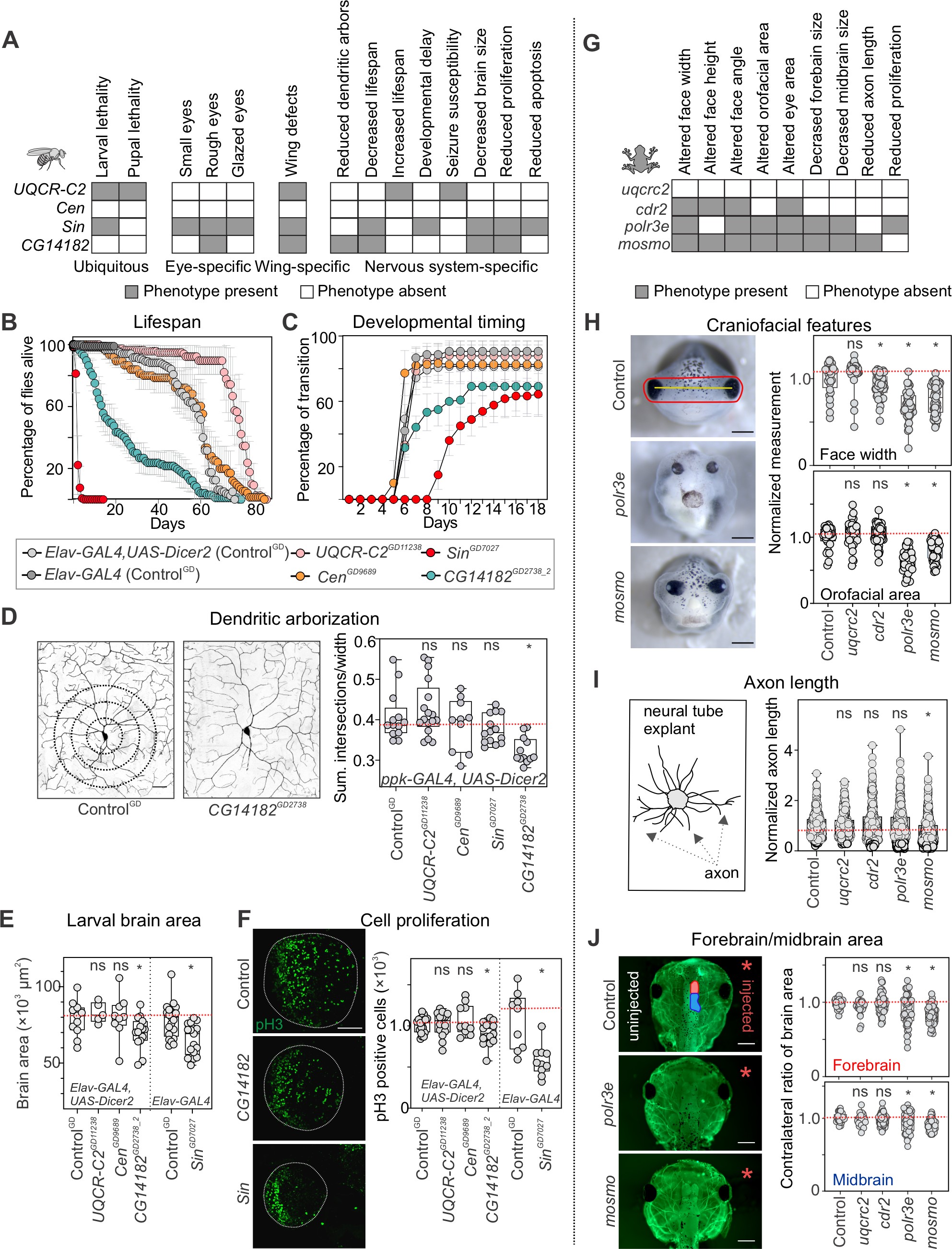 Fig 2. Multiple homologs of 16p12.1 genes contribute to neurodevelopmental defects in Drosophila melanogaster and X. laevis. (A) Schematic showing multiple phenotypes affected by tissue-specific knockdown of individual 16p12.1 homologs in Drosophila melanogaster. Ubiquitous knockdown was achieved with da-GAL4, eye-specific knockdown with GMR-GAL4, wing-specific knockdown with bxMS1096-GAL4, and nervous system-specific with ppk-GAL4 or Elav-GAL4. See S2AâS2C Fig for details on phenotypes observed for individual fly lines. (B) Nervous-system mediated knockdown using Elav-GAL4 with overexpression of Dicer2 at 25°C led to reduced lifespan with knockdown of CG14182GD2738_2 (n = 100, one-way repeat measures ANOVA with post-hoc pairwise t-test, days 6â61, p<0.05) and increased lifespan with knockdown of UQCR-C2GD11238 (n = 120, days 51â81, p<0.05). Elav-GAL4 mediated knockdown of SinGD7027 at RT without overexpression of Dicer2 led to reduced lifespan of adult flies (n = 160, day 1â6, p<0.05). Data represented show mean ± standard deviation of 4â8 independent groups of 20 flies for each line tested. (C) Nervous-system mediated knockdown led to delayed pupariation time and larval lethality for SinGD7027 (n = 180, one-way repeat measures ANOVA with post-hoc pairwise t-test, days 6â18, p<0.05) and partial larval lethality for CG14182GD2738_2 (n = 120, days 7â11, p<0.05). Data represented show mean ± standard deviation of 4â9 independent groups of 30 larvae for each line tested. (D) Knockdown of 16p12.1 homologs in sensory class IV dendritic arborization neurons using ppk-GAL4 with overexpression of Dicer2 showed reduced complexity of dendritic arbors (measured as sum of intersections normalized to width) for CG14182GD2738 (n = 12, two-tailed Mann-Whitney, *p = 5.35 Ã10â5). Scale bar represents 25 μm. (E) Third instar larvae with nervous system-specific knockdown of 16p12.1 homologs showed reduced brain area for CG14182GD2738_2 (n = 15, two-tailed Mann-Whitney, *p = 0.047) and SinGD7027 (n = 17, *p = 0.001). (F) Developing third instar larvae with knockdown of CG14182GD2738_2 (n = 15, two-tailed Mann-Whitney, *p = 0.026) and SinGD7027 (n = 10, *p = 9.74Ã10â4) showed reduced number of phosphorylated Histone-3 (pH3) positive cells in the brain lobe (green). Scale bar represents 50 μm. All control data for Drosophila represents phenotypes observed for the GD VDRC control (ControlGD) crossed with the indicated tissue-specific GAL4 driver. (G) Schematic showing the phenotypes observed with knockdown of 16p12.1 homologs in X. laevis. (H) Representative images of tadpoles injected with control morpholino, indicating facial landmarks for face width (yellow) and orofacial area (red), and tadpoles with knockdown of polr3e and mosmo. Knockdown of cdr2 (n = 54, two-tailed studentâs t-test, *p = 7.75 Ã10â4), polr3e (n = 37, *p = 1.97 Ã10â13) and mosmo (n = 50, *p = 1.36 Ã10â11) led to decreased face width, while knockdown of polr3e (*p = 3.29 Ã10â16) and mosmo (*p = 1.47 Ã10â8) led to decreased orofacial area. All measures were normalized to their respective control injected with the same morpholino amount. Scale bar represents 500 μm. (I) Strong knockdown of mosmo led to decreased axon length in neural tube explants (n = 566, two-tailed studentâs t-test, *p = 7.40 Ã10â12). All measures were normalized to their respective control injected with the same morpholino amount. Representative schematic for axon length measurements is shown on the left. (J) Representative images show forebrain (red on control image) and midbrain (blue) areas of the side injected with morpholino (right, red asterisk), which were normalized to the uninjected side (left). Strong knockdown of mosmo (n = 67, two-tailed studentâs t-test, *p<3.07Ã10â13) and polr3e (n = 48, *p<7.39Ã10â4) led to decreased midbrain and forebrain area of X. laevis tadpoles (stained with tubulin). Scale bar represents 500 μm. In all cases, X. laevis data represents strong knockdown of the 16p12.1 homologs, except for cdr2, which showed lethality and is represented with partial knockdown. All control data for X. laevis represents controls injected with the highest amount of morpholino (50 ng, see S5 Fig). Boxplots represent all data points with median, 25th and 75th percentiles, and red dotted lines indicate the control median. Statistical details, including sample size, confidence intervals, and p-values, are provided in S6 File. A list of full genotypes for fly crosses used in these experiments is provided in S1 File. https://doi.org/10.1371/journal.pgen.1009112.g002 |