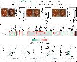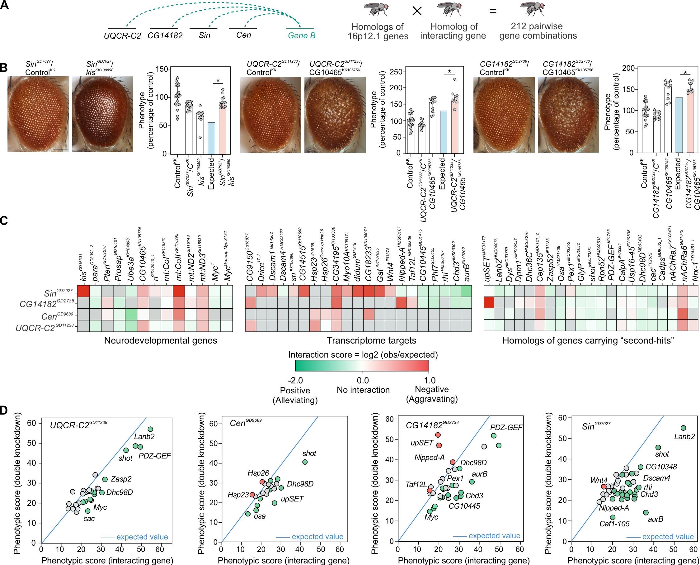 Fig 4. Homologs of 16p12.1 genes show complex interactions with conserved neurodevelopmental genes and homologs of patient-specific âsecond-hitâ genes. (A) We evaluated how homologs of genes outside of the CNV region (Gene B), including genes carrying âsecond-hitâ variants in children with the 16p12.1 deletion, genes within conserved neurodevelopmental pathways, and transcriptome targets, affect the phenotypes observed for homologs of 16p12.1 genes. We crossed eye-specific recombinant lines for each homolog with a total of 124 RNAi, mutant or overexpression lines for 76 interacting genes to test a total of 212 pairwise gene combinations. (B) Representative brightfield images of Drosophila adult eyes for recombinant lines of 16p12.1 homologs crossed with background-specific controls (ControlKK, also represented as CKK) or RNAi lines for kis and CG10465, are shown as examples of genetic interactions between the 16p12.1 homologs and homologs of neurodevelopmental genes. Bar plots show normalized phenotypes (median ± interquartile range) for 16p12.1 recombinant lines crossed with background-specific control or with RNAi lines for interacting genes. SinGD7027 negatively interacted with kisKK100890 and led to a more severe phenotype (two-tail one-sample Wilcoxon signed rank test with Benjamini-Hochberg correction, n = 11, *p = 0.012, in red) than expected (in blue) under a multiplicative model. Similarly, CG10465KK105756 negatively interacted with UQCR-C2GD11238 (n = 10, *p = 0.024) and CG14182GD2738 (n = 10, *p = 0.015), leading to more severe eye phenotypes than expected. Phenotypes are represented as percentage of average, i.e. normalized to Flynotyper scores from control flies carrying the same genetic background as the interacting gene. Scale bar represents 100 μm. (C) Heatmaps show interaction scores calculated as the log2 ratio between the average of observed and expected phenotypic scores. Positive scores represent negative aggravating genetic interactions (in red), while negative scores represent positive alleviating interactions (in green). Grey boxes indicate pairwise crosses that were not tested or were not validated by multiple lines. A complete list of interaction scores is provided in S4 File. (D) Scatter plots depict interactions tested for 16p12.1 homologs. The plots show the average phenotypic score of the interacting gene on the x-axis, and the average observed phenotypic score for the pairwise knockdown on the y-axis. The blue line represents the expected phenotypic score of the pairwise knockdown calculated for each 16p12.1 homolog (value of first hit crossed with control, such as UQCR-C2GD11238 à ControlBL), and all possible phenotypic scores (ranging from 0 to 60) of the interacting genes are represented on the x-axis. All positive and negative (validated or potential) interactions are represented in green and red, respectively, and fly lines of genes with no significant interactions are shown in grey. Only lines from the BDSC stock center are represented here; S17 Fig shows scatter plots representing VDRC stock lines. https://doi.org/10.1371/journal.pgen.1009112.g004 |