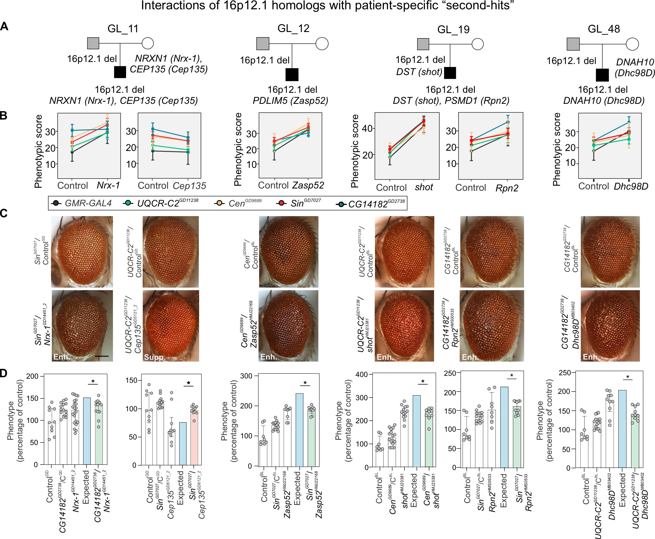 Fig 5. Homologs of patient-specific âsecond-hitsâ modulate phenotypes of 16p12.1 homologs. (A) Representative pedigrees of families with 16p12.1 deletion (affected child in black, carrier parent in grey) that were selected to study the effect of homologs (represented within parenthesis) of genes carrying âsecond-hitsâ towards phenotypes of homologs of 16p12.1 genes. (B) Observed phenotypic changes of 16p12.1 homologs by patient-specific âsecond-hitâ homologs. Plots show the changes in Flynotyper scores (mean ± s.d.) for GMR-GAL4 control (grey) or recombinant lines of 16p12.1 homologs crossed with either background-specific control line (left) or with âsecond-hitâ homologs (right). We note that represented changes in Flynotyper scores for CenGD9689/Nrx-1GD14451_2, UQCR-C2GD11238/Zasp52HMJ22168, and SinGD7027/Zasp52HMJ22168 were not validated with multiple RNAi lines for the âsecond-hitâ homolog. Flynotyper values for all the tested pairwise knockdowns are shown in S11âS14 Figs and validated enhancements and suppressions (using Mann-Whitney tests) are shown in S15 and S16 Figs. (C) Representative brightfield adult eye images for pairwise knockdowns that enhanced (Enh.) or suppressed (Supp.) phenotypes of 16p12.1 homologs are shown. Scale bar represents 100 μm. (D) Examples of genetic interactions identified between the 16p12.1 homologs and homologs of patient-specific âsecond-hitâ genes using the multiplicative model. Bar plots show normalized phenotypes (median ± interquartile range) for the 16p12.1 recombinant lines crossed with background-specific controls (ControlGD or ControlBL, also represented as CGD, CBL, respectively) or with RNAi lines for Nrx-1GD14451_2, Cep135GD6121_2, Zasp52HMJ22168, shotHMJ23381, Rpn2HMS0533, Dhc98DMB03402. SinGD7027 negatively interacted with Cep135GD6121_2 and led to a more aggravating phenotype (two-tail one-sample Wilcoxon signed rank test with Benjamini-Hochberg correction, n = 10, *p = 0.012, in red) than expected (in blue) under a multiplicative model, while other examples of pairwise knockdowns with homologs âsecond-hitâ genes shown here led to positive genetic interactions (*p<0.05, in green). Details of number of homologs, fly lines and crosses, as well as a list of full genotypes for all interaction experiments are provided in S1 File. Statistical details, including sample size, confidence intervals, and p-values, are provided in S6 File. https://doi.org/10.1371/journal.pgen.1009112.g005 |