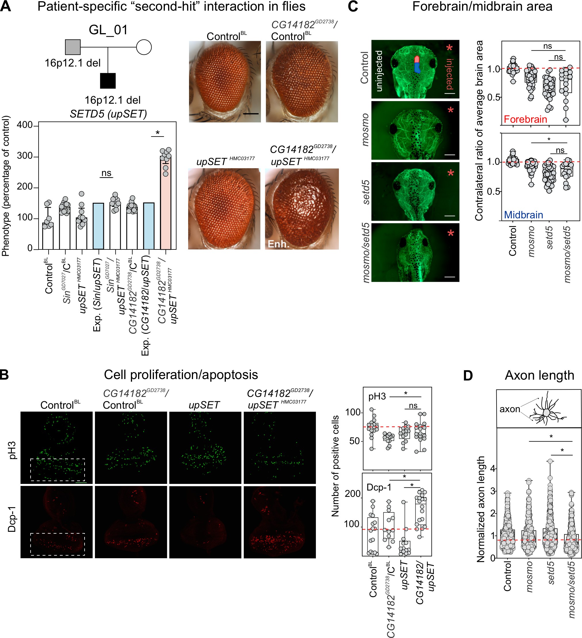 Fig 6. Homolog of SETD5 synergistically interacts with homolog of MOSMO to modify neurodevelopmental defects. (A) Pedigree of a family with 16p12.1 deletion, with the proband also carrying a de novo pathogenic mutation in SETD5. Representative brightfield adult eye images for control and GMR-GAL4 knockdown of CG14182GD2738, upSETHMC03177, and CG14182GD2738/upSETHMC03177 are shown. Data show a negative genetic interaction with simultaneous knockdown of CG14182GD2738 and upSETHMC03177. Bar plots show normalized phenotypes (median ± interquartile range) for recombinant lines of CG14182GD2738 and SinGD7027 crossed with background-specific control (ControlBL, also represented as CBL) or upSETHMC03177. An aggravating phenotype is observed with CG14182GD2738/upSETHMC03177 (two-tailed one-sample Wilcoxon signed rank test with Benjamini-Hochberg correction, n = 9, *p = 0.018, in red) compared with expected (in blue). (B) Representative confocal images of third instar larval eye discs stained with anti-phosphorylated histone-3 (pH3, green) or anti-Dcp-1 (red), markers of cellular proliferation and apoptosis, respectively. Positive pH3 or Dcp-1 cells were quantified posterior to the morphogenetic furrow, indicated by white boxes in left panels. Double knockdown of CG14182GD2738/upSETHMC03177 led to increased pH3 (n = 17, two-tailed Mann-Whitney, *p = 0.046) and Dcp-1 (n = 19, *p = 0.006) positive cells compared to knockdown of CG14182GD2738 alone. The double knockdown also led to increased Dcp-1 positive cells compared to knockdown of upSETHMC03177 alone (*p = 2.19Ã105). Scale bar represents 50 μm. (C) Representative images of tadpoles stained with anti-tubulin show forebrain (red on control image) and midbrain (blue) areas of the side injected with morpholino (right, red asterisk), which were normalized to the uninjected side (left). Partial knockdown of mosmo with setd5 led to a reduction in the midbrain area compared to the knockdown of mosmo alone (n = 16, two-tailed studentâs t-test, *p = 0.047). Control data represents control injected with highest amount of morpholino (22ng). Scale bar represents 500 μm (D) Normalized axon length of X. laevis tadpoles with simultaneous knockdown of mosmo and setd5 led to a significant reduction in axon length that was not observed with partial knockdown of mosmo (n = 438, two-tailed studentâs t-test, *p = 3.34 Ã10â6) or setd5 (*p = 1.86 Ã10â9). All measures were normalized to their respective controls injected with the same morpholino amount (See S20 Fig). Control data represents controls injected with highest amount of morpholino (22ng). All double knockdown experiments were performed with partial knockdown of the genes, to avoid potential lethality with stronger knockdown. Boxplots represent all data points with median, 25th and 75th percentiles, and red dotted lines indicate the control median. A list of full genotypes for fly crosses used in these experiments is provided in S1 File. Statistical details, including sample size, confidence intervals, and p-values, are provided in S6 File. https://doi.org/10.1371/journal.pgen.1009112.g006 |