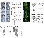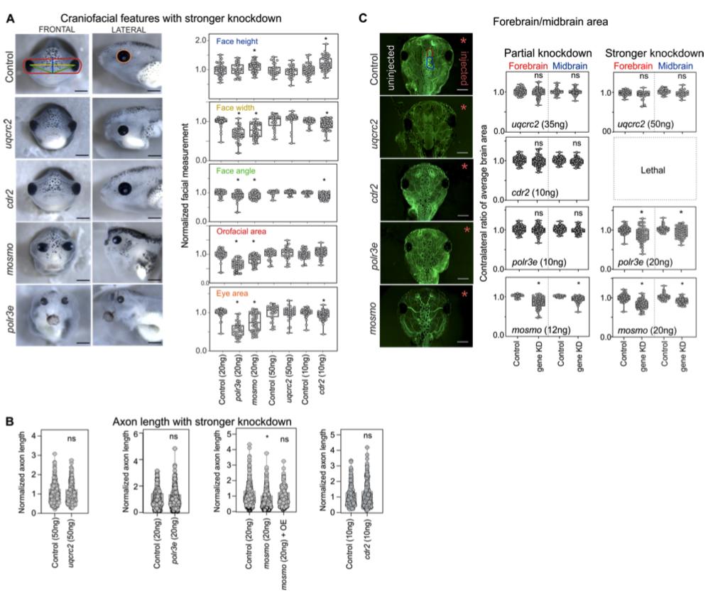S5 Fig. Decreased dosage of 16p12.1 homologs leads to multiple neurodevelopmental phenotypes in X. laevis. (A) Representative images of tadpoles injected with control morpholino or morpholinos for 16p12.1 homologs, indicating facial landmarks for face width (yellow), height (blue), angle (green), and orofacial (red) and eye (orange) area. Boxplots showing face height, width, angle, and orofacial and eye area of each knockdown compared to its own control. Knockdown of mosmo (n = 50, two-tailed studentâs t-test, *p = 0.010) and cdr2 (n = 54, *p = 3.68Ã10â6) led to increased face height. Knockdown of cdr2 (*p = 7.75 Ã10â4), polr3e (n = 37, *p = 1.97 Ã10â13) and mosmo (*p = 1.36 Ã10â11) led to decreased face width, while knockdown of cdr2 (*p = 1.03Ã10â8), polr3e (*p = 2.73Ã10â4) and mosmo (*p = 3.50Ã10â7) led to decreased face angle. Knockdown of polr3e (*p = 3.29 Ã10â16) and mosmo (*p = 1.47 Ã10â8) led to decreased orofacial area, and knockdown of polr3e (*p = 1.01Ã10â18), mosmo (*p = 7.23Ã10â10) and cdr2 (*p = 0.009) led to decreased eye area. Data represents strong knockdown of the 16p12.1 homologs, except for cdr2, which showed lethality and is shown for partial knockdown. All measures were normalized to their respective control injected with the same morpholino amount. Scale bars represent 500μm. (B) Boxplots showing axon length of each knockdown compared to its own control. Strong knockdown of mosmo led to decreased axon length in neural tube explants (n = 548, two-tailed studentâs t-test, *p = 7.40 Ã10â12), which was rescued by co-injection with overexpressed (OE) mRNA of the gene (n = 566, *p = 4.06Ã10â5). All measures were normalized to their respective control injected with the same morpholino amount. (C) Representative images stained with anti-tubulin show forebrain (red on control image) and midbrain (blue) areas of the side injected with morpholino (right, red asterisk), which were normalized to the uninjected side (left). Partial knockdown of mosmo led to decreased forebrain (n = 47, two tailed studentâs t-test, *p = 1.18Ã10â9) and midbrain (*p = 1.45Ã10â7) area. Graphs represent contralateral ratio of brain area compared to uninjected side of the embryo. Scale bars represent 500μm. All boxplots represent all data points with median, 25th and 75th percentiles. In each case, measurements for each knockdown were compared to controls injected with equal amounts of morpholino. Statistical details, including sample size, confidence intervals, and p-values, are provided in S6 File. https://doi.org/10.1371/journal.pgen.1009112.s005 |