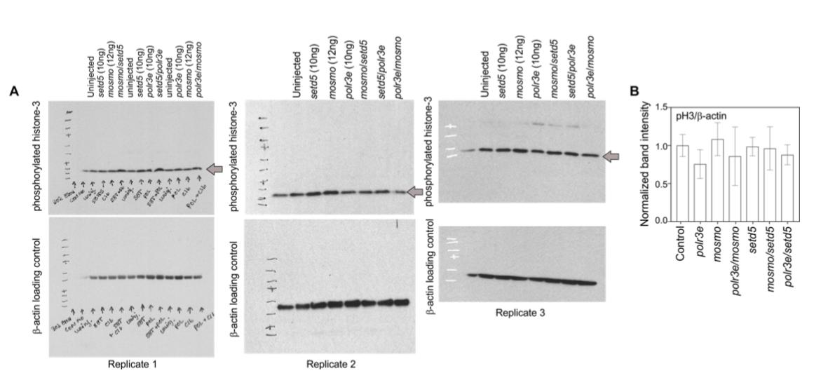 S6 Fig. Whole western blot for phosphorylated histone-3 in X. laevis embryos with knockdown of polr3e, mosmo and setd5. (A) Three replicate western blot experiments were performed. The intensity of bands at 17 kDa, corresponding with pH3 (top, indicated with arrow), were normalized to the β-actin loading control (bottom). (B) Partial knockdown of polr3e shows reduced band intensity with anti-pH3 antibody compared to β-actin loading control. Bar plot represents mean ± SD. https://doi.org/10.1371/journal.pgen.1009112.s006 |